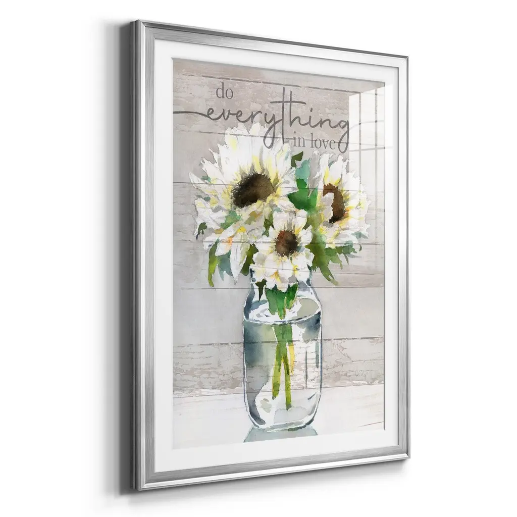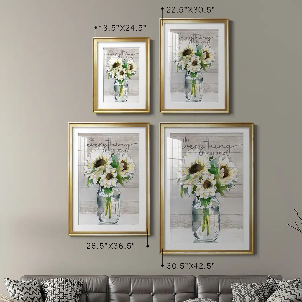 Do Everything In Love Premium Framed Print - Ready to Hang A Premium Framed Print created to last. Framed in distressed wood and available in an array of sizes and colors Featuring a beveled a solid wood stretcher bar, each piece comes ready to hand 4 SIZES AVAILABLE 30.5''X42.5'' - Overall Size 26.5'X36.5'' - Overall Size 22.5''x30.5'' - Overall Size 18.5''x24.5'' - Overall Size Each piece is made to order. Each piece comes with hanging hardware. Made in the USA Ready to Hang Giclee Paper Print Acrylic Glass Beveled Matt Board