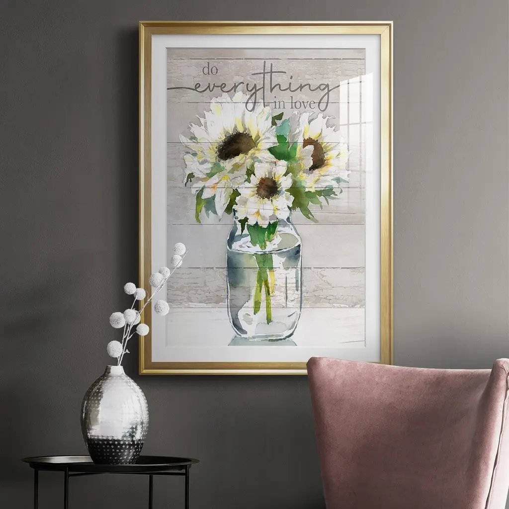 Do Everything In Love Premium Framed Print - Ready to Hang A Premium Framed Print created to last. Framed in distressed wood and available in an array of sizes and colors Featuring a beveled a solid wood stretcher bar, each piece comes ready to hand 4 SIZES AVAILABLE 30.5''X42.5'' - Overall Size 26.5'X36.5'' - Overall Size 22.5''x30.5'' - Overall Size 18.5''x24.5'' - Overall Size Each piece is made to order. Each piece comes with hanging hardware. Made in the USA Ready to Hang Giclee Paper Print Acrylic Glass Beveled Matt Board