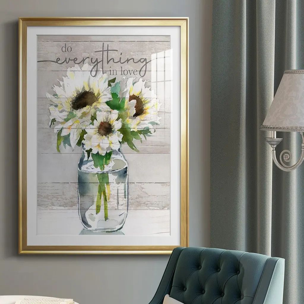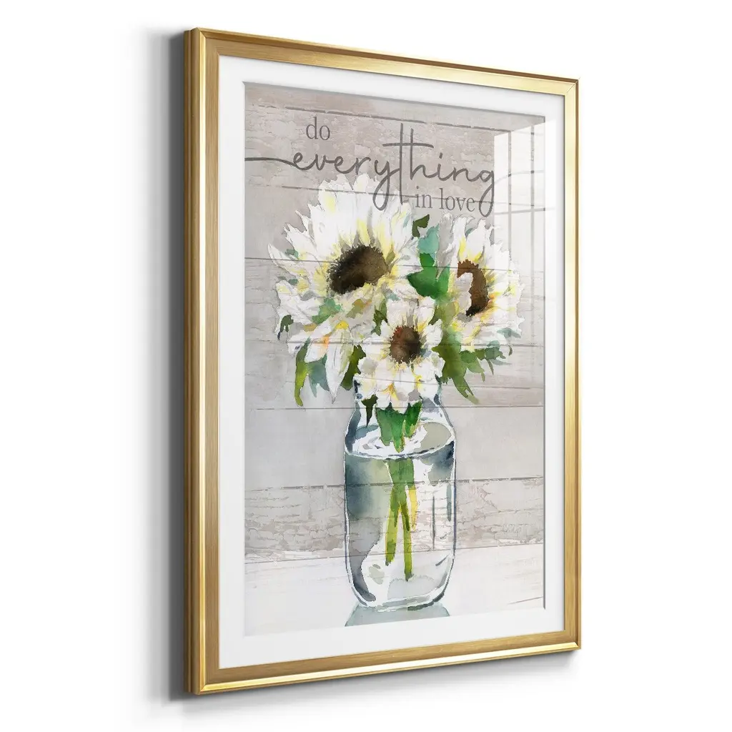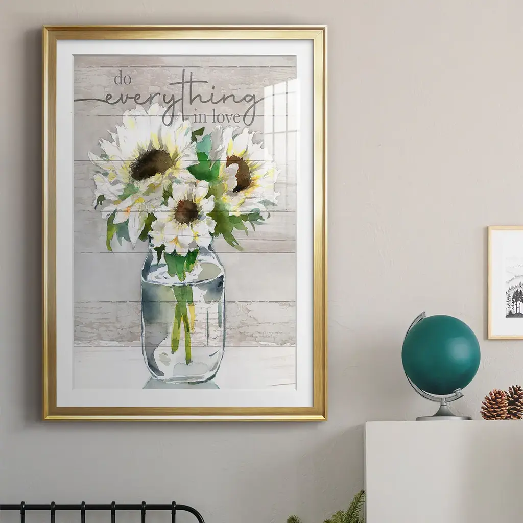 Do Everything In Love Premium Framed Print - Ready to Hang A Premium Framed Print created to last. Framed in distressed wood and available in an array of sizes and colors Featuring a beveled a solid wood stretcher bar, each piece comes ready to hand 4 SIZES AVAILABLE 30.5''X42.5'' - Overall Size 26.5'X36.5'' - Overall Size 22.5''x30.5'' - Overall Size 18.5''x24.5'' - Overall Size Each piece is made to order. Each piece comes with hanging hardware. Made in the USA Ready to Hang Giclee Paper Print Acrylic Glass Beveled Matt Board