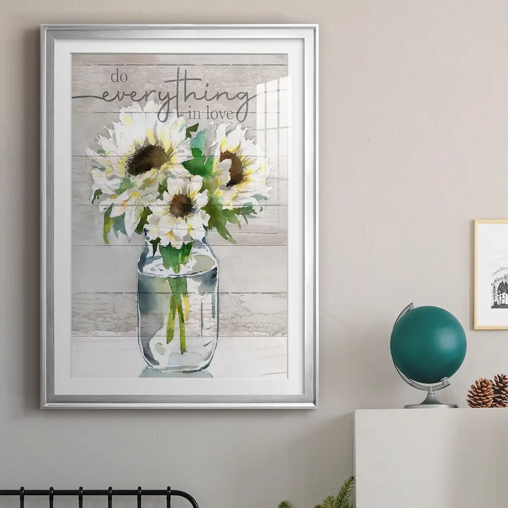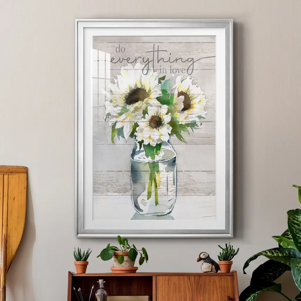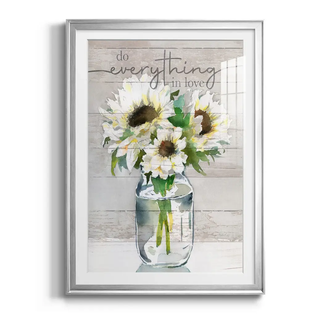 Do Everything In Love Premium Framed Print - Ready to Hang A Premium Framed Print created to last. Framed in distressed wood and available in an array of sizes and colors Featuring a beveled a solid wood stretcher bar, each piece comes ready to hand 4 SIZES AVAILABLE 30.5''X42.5'' - Overall Size 26.5'X36.5'' - Overall Size 22.5''x30.5'' - Overall Size 18.5''x24.5'' - Overall Size Each piece is made to order. Each piece comes with hanging hardware. Made in the USA Ready to Hang Giclee Paper Print Acrylic Glass Beveled Matt Board