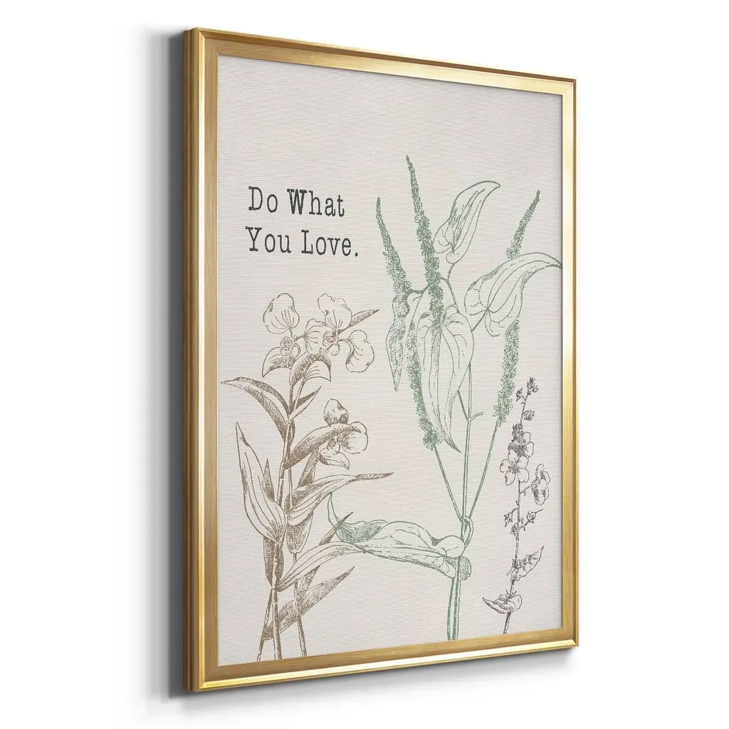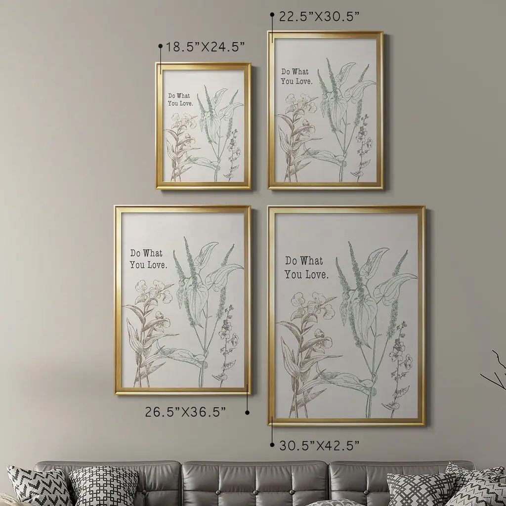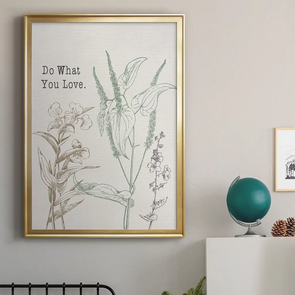 Do What You Love Premium Framed Print - Ready to Hang A Premium Framed Print created to last. Framed in distressed wood and available in an array of sizes and colors Featuring a beveled a solid wood stretcher bar, each piece comes ready to hand 4 SIZES AVAILABLE 30.5''X42.5'' - Overall Size 26.5'X36.5'' - Overall Size 22.5''x30.5'' - Overall Size 18.5''x24.5'' - Overall Size Each piece is made to order. Each piece comes with hanging hardware. Made in the USA Ready to Hang