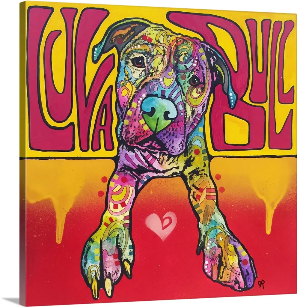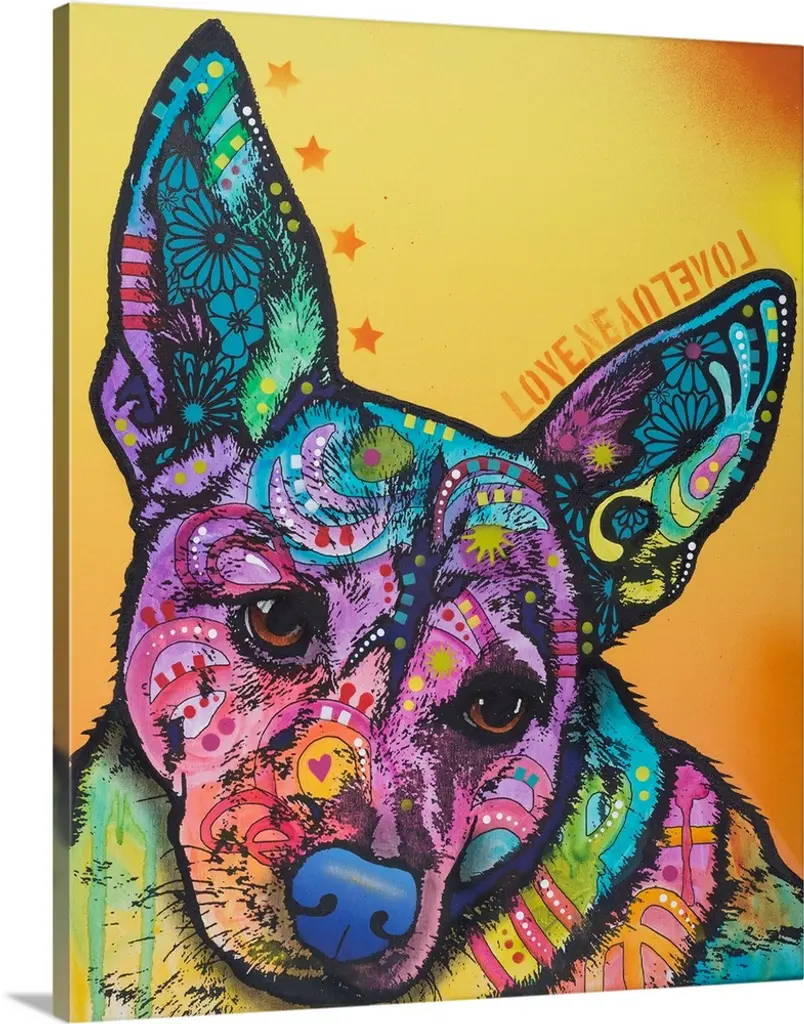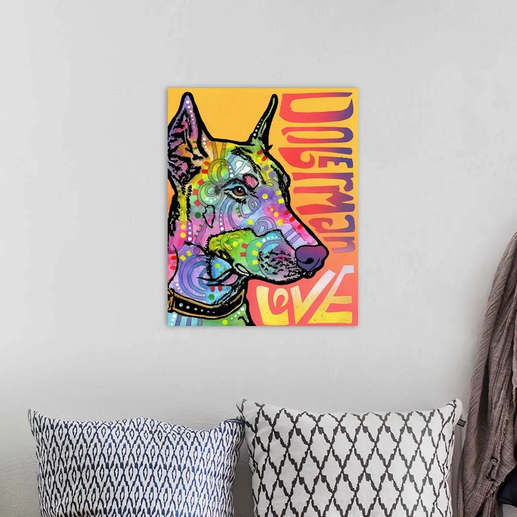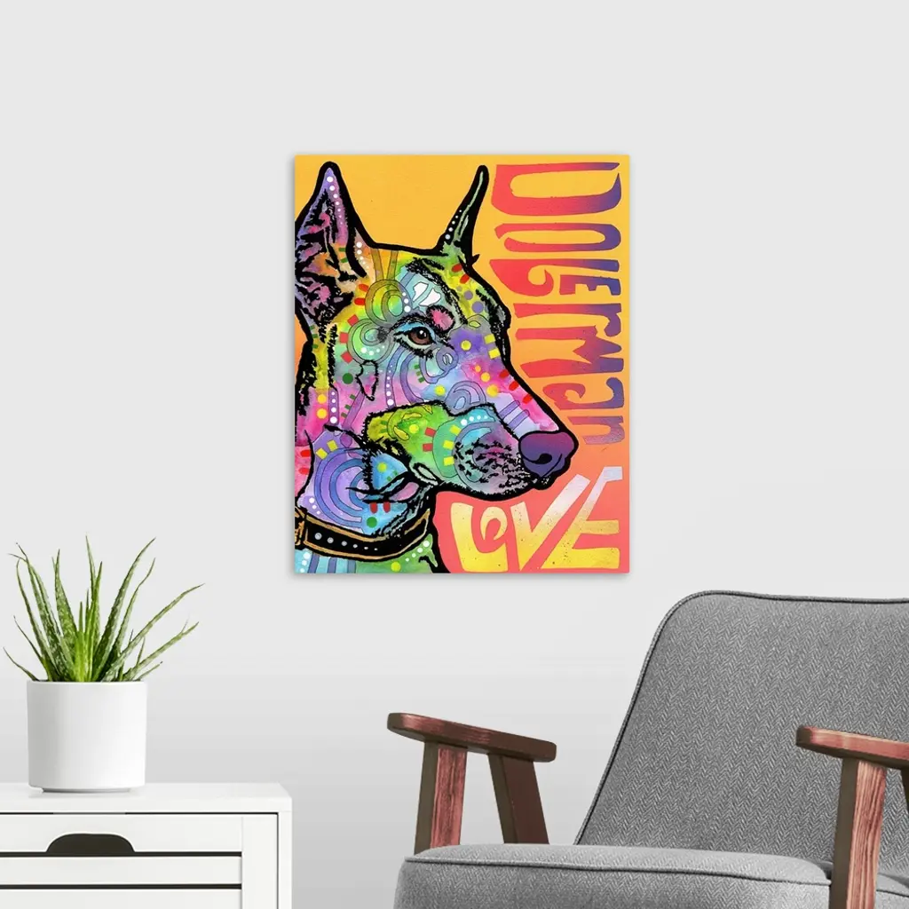 Colorful painting of a Doberman with graffiti-like designs on a pink and orange background with "Doberman Love" spray painted around the side.