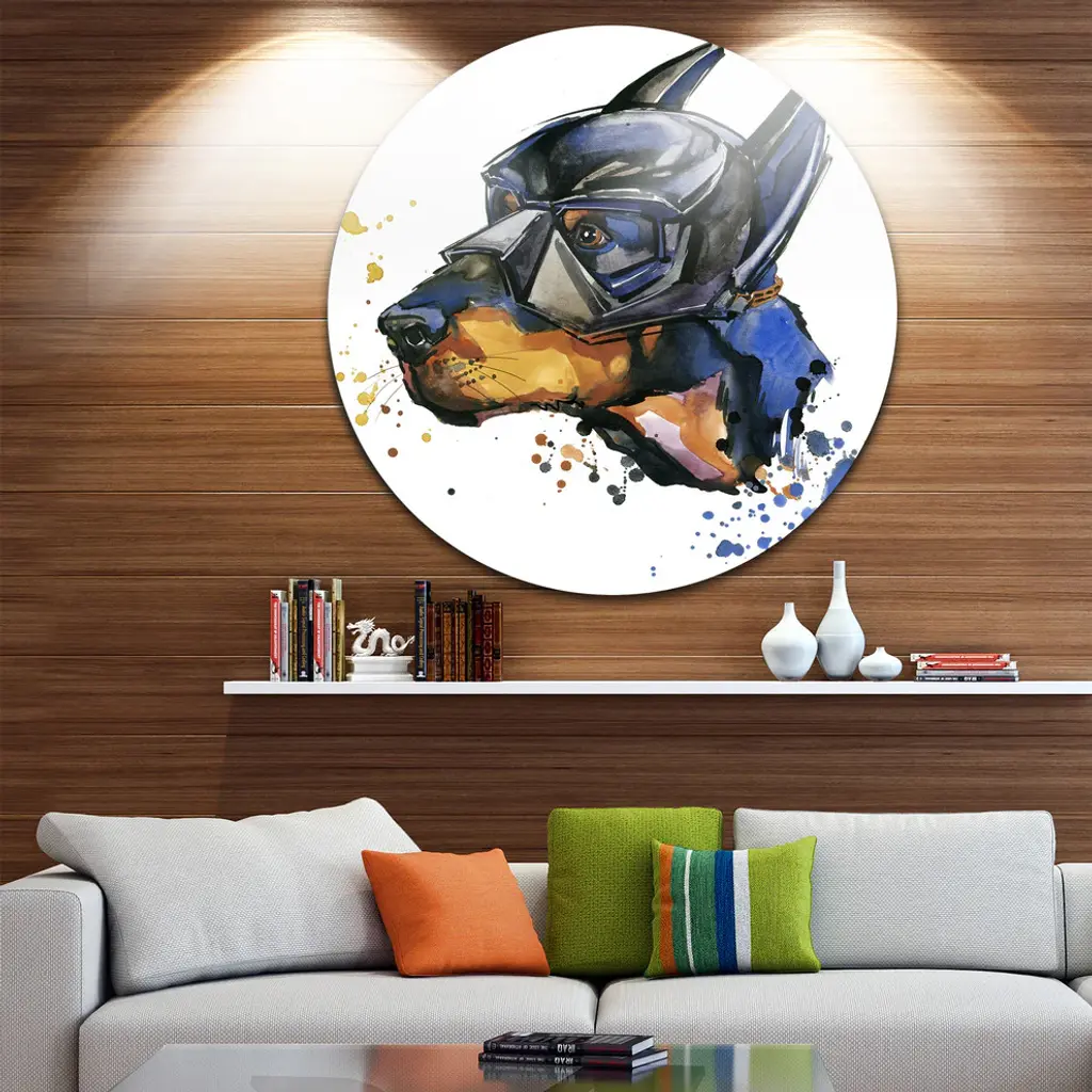 Bring Contemporary Abstraction to your home with this large Circle Metal wall art. This Doberman Superman Metal Artwork makes it the focal point of any room or office. - White Gloss Coating ensures colors are extra vibrant with light reflection.- Aluminum grade Sheet Metal with 1 inch mounting frame on the back giving the illusion that the artwork is floating on the wall..- Mounting Brackets are included along with instructions.- High Quality Digital images are created directly into a glossy aluminum panel producing a stunning and captivating print into the glossy finish of the metal.- Water, Fire and Scratch resistant HD Aluminum panels.- Looks better than any photo paper and guaranteed to last at least 20 years- Easy to clean with a microfiber cloth. Colors are far superior to regular Canvas Art. - Easy to Hang