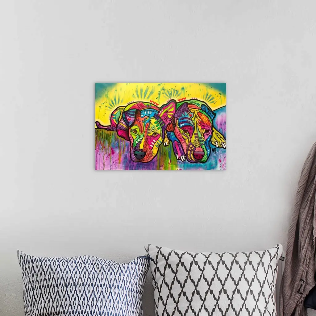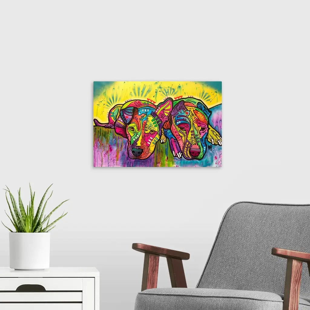 Contemporary stencil painting of two pit bulls filled with various colors and patterns.