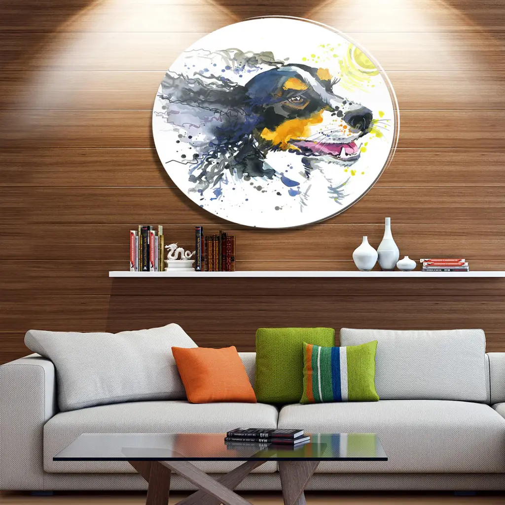 Bring Contemporary Abstraction to your home with this large Circle Metal wall art. This Dog and Yellow Ball Watercolor Metal Artwork makes it the focal point of any room or office. - White Gloss Coating ensures colors are extra vibrant with light reflection.- Aluminum grade Sheet Metal with 1 inch mounting frame on the back giving the illusion that the artwork is floating on the wall..- Mounting Brackets are included along with instructions.- High Quality Digital images are created directly into a glossy aluminum panel producing a stunning and captivating print into the glossy finish of the metal.- Water, Fire and Scratch resistant HD Aluminum panels.- Looks better than any photo paper and guaranteed to last at least 20 years- Easy to clean with a microfiber cloth. Colors are far superior to regular Canvas Art. - Easy to Hang