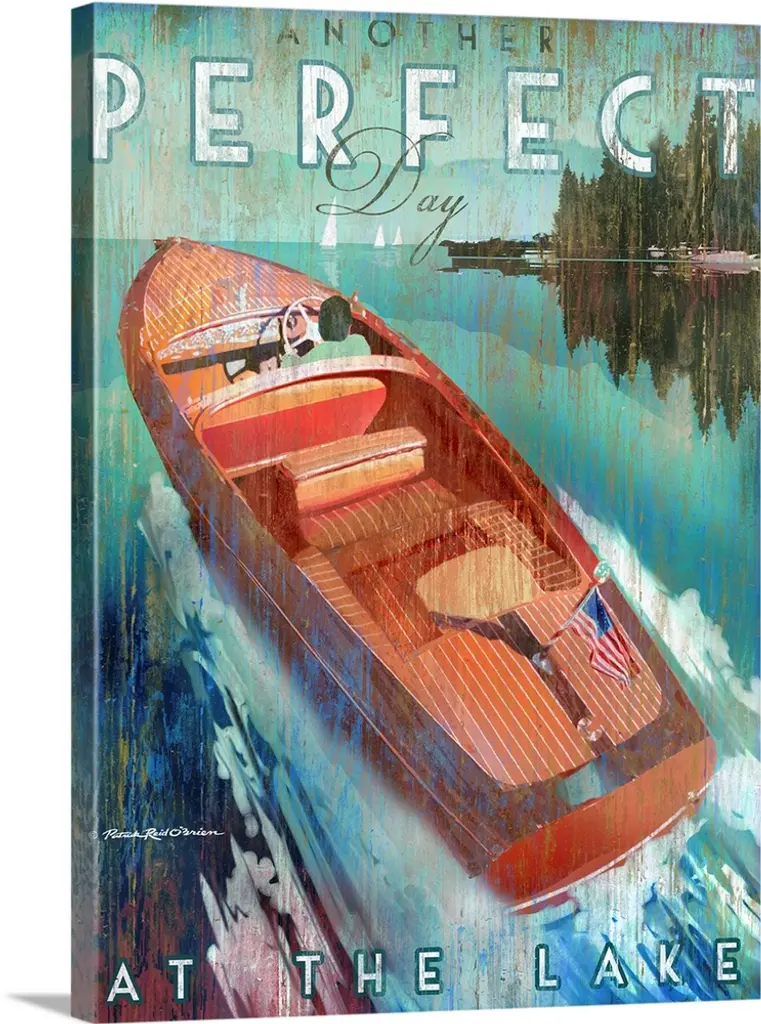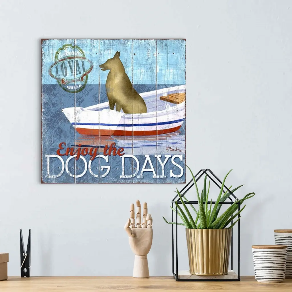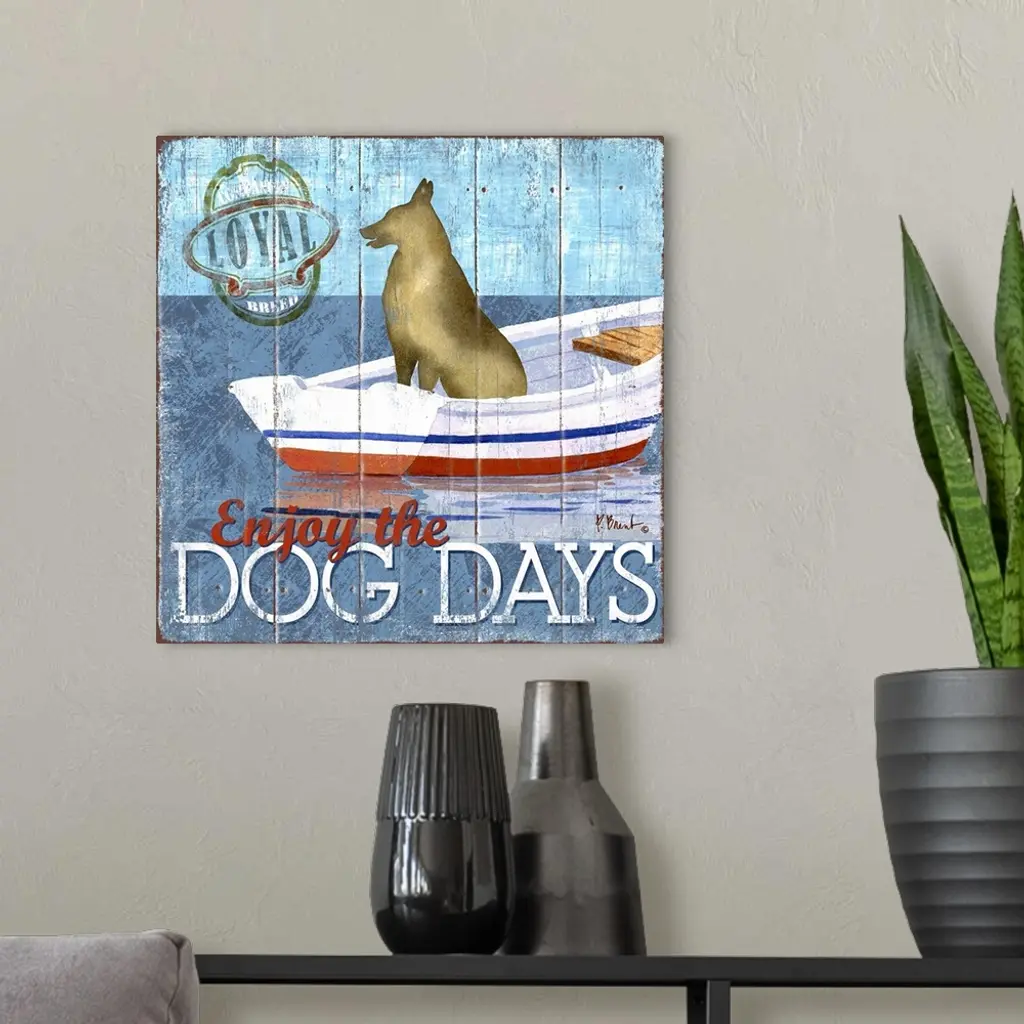 Contemporary decorative artwork of a German Shepherd dog on a boat with the words "Enjoy the Dog Days."