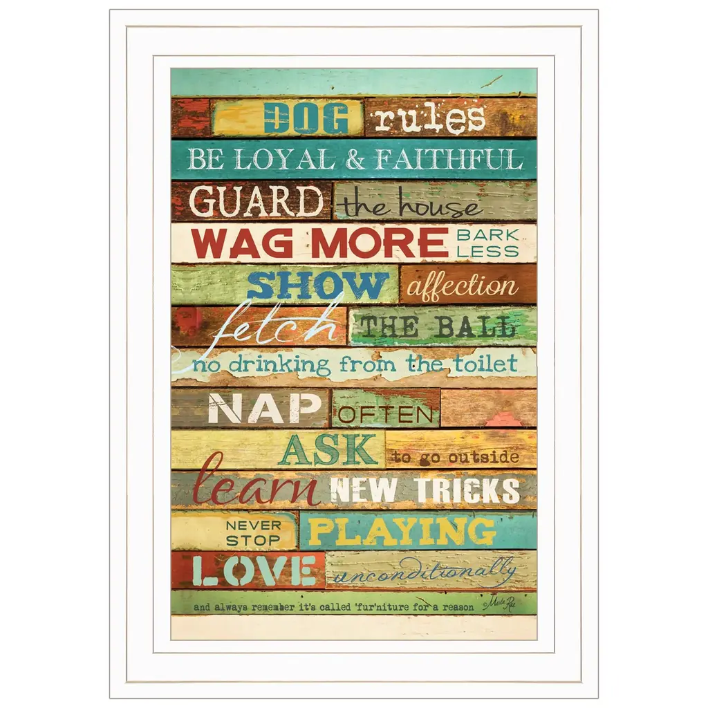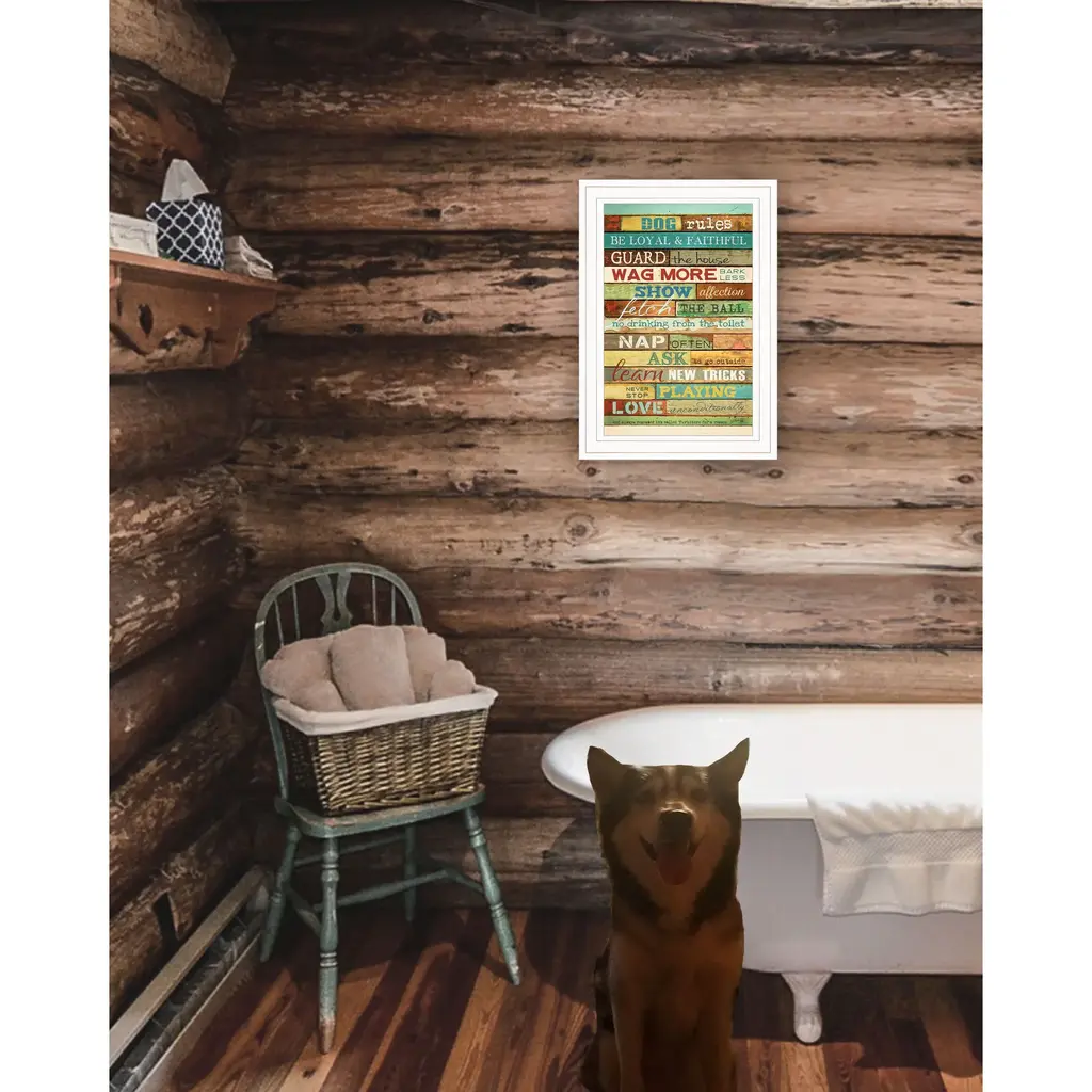 This dog rules 2 white framed print wall art will add a beautiful decorative accent to your decor. This print is a visual artistic expression that allows you to decorate your space in style. Reproduced for you on paper, this hanging decorative accent will be a trendy and fashionable way to dress your walls. Hang on your wall to add some up to date fashion and decoration. Utilize this opportunity to create a focal point in the room with this fabulous wall decor option. 11" H x 15" W x 1" D