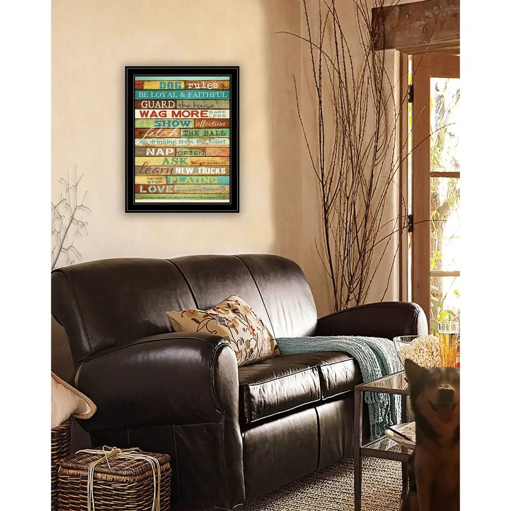 Add an air of fashion to your room and rejuvenate the space with this dog rules 7 black framed print wall art. This print is a visual artistic expression that allows you to decorate your space in style. Reproduced for you on paper, this hanging decorative accent will be a trendy and fashionable way to dress your walls. Hang on your wall to add some up to date fashion and decoration. Instantly liven up your space with this art that brings color and dimension to your walls. 15" H x 11" W x 1" D