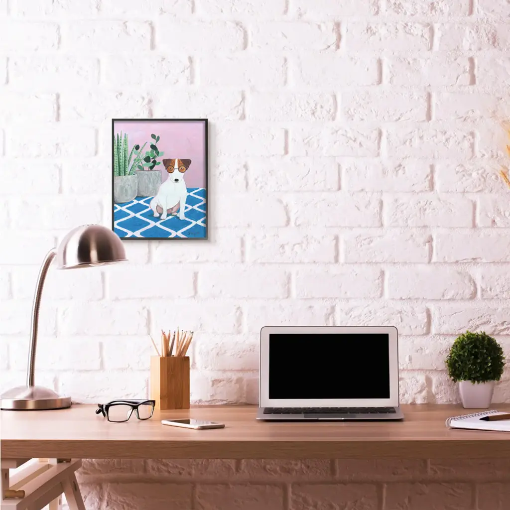 Dog With Plants Pink Blue Pet Painting, 11"x14"