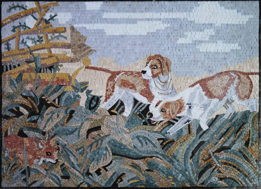 Introducing our "Dogs Hunting A Fox - Mosaic Artwork," a stunning piece that captures the thrilling pursuit of two dogs chasing after a fox. This exquisite artwork serves as a captivating focal point for any room, adding depth and character to your living spaces. Crafted meticulously from high-quality marble and tiles, this animal mosaic artwork combines both craftsmanship and artistry to create a unique visual experience.Each tile is thoughtfully placed to portray the dynamic motion and expressive faces of the dogs, showcasing their energy and determination. The intricate details of the fox add an element of excitement, making this piece not just a decoration, but a storytelling element in your home. The vibrant colors and textures of the marble enhance the lifelike representation, making it a great conversation starter for guests.Perfect for dog lovers and art enthusiasts alike, this mosaic artwork can seamlessly fit into various decor styles, from rustic to modern. Hang it in your living room, entryway, or even a dedicated art space to enrich your environment with the spirit of adventure and the bond between animals.Elevate your home decor with the "Dogs Hunting A Fox - Mosaic Artwork." This animal mosaic artwork is not just wall decor; it’s a piece of art that resonates with emotion, bringing a sense of nature and vitality indoors. Don’t miss out on the opportunity to own this masterpiece that celebrates the beauty of wildlife and the thrill of the chase.