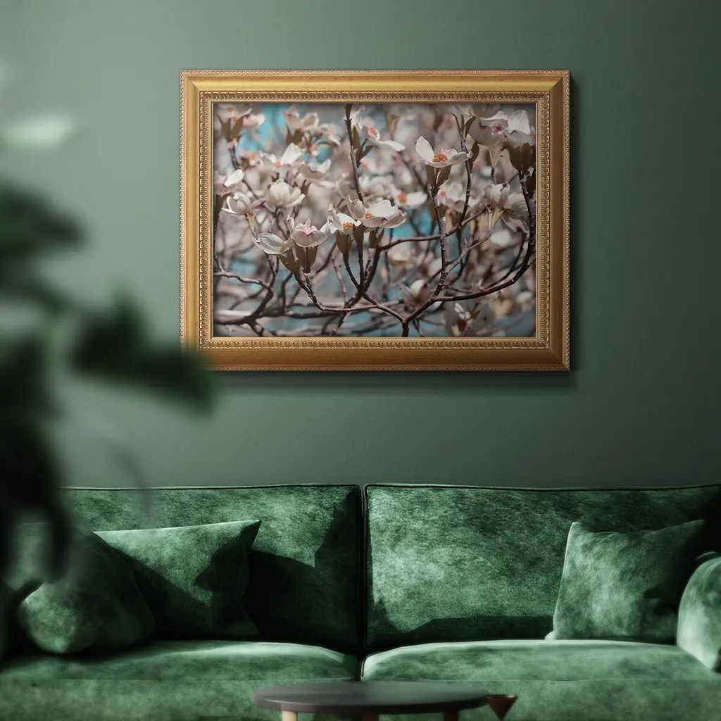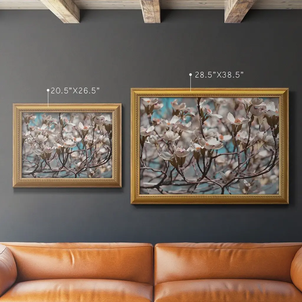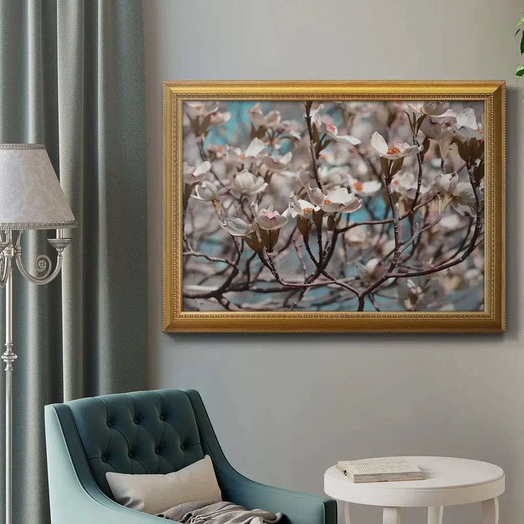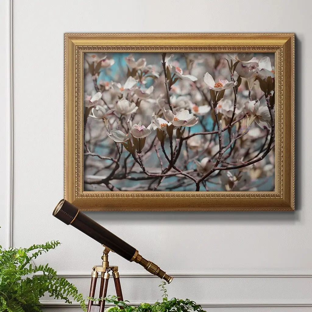 Dogwood Spring I Premium Framed Canvas- Ready to Hang A Premium Framed Canvas created to last. Framed in distressed wood and available in an array of sizes and colors Featuring a beveled a solid wood stretcher bar, each piece comes ready to hand 3 SIZES AVAILABLE 16''X20'' - Overall Size 18'X27'' - Overall Size 24''x36'' - Overall Size Each piece is made to order. Each piece comes with hanging hardware. Made in the USA Ready to Hang Giclee Paper Print Acrylic Glass Beveled Matt Board