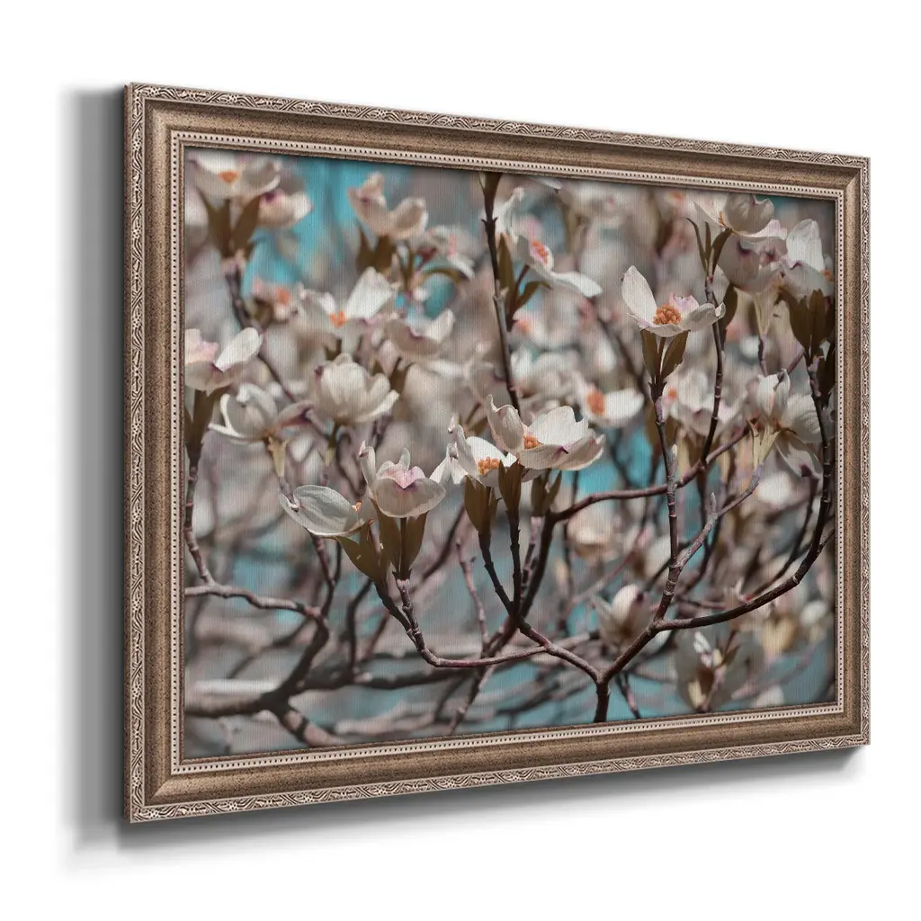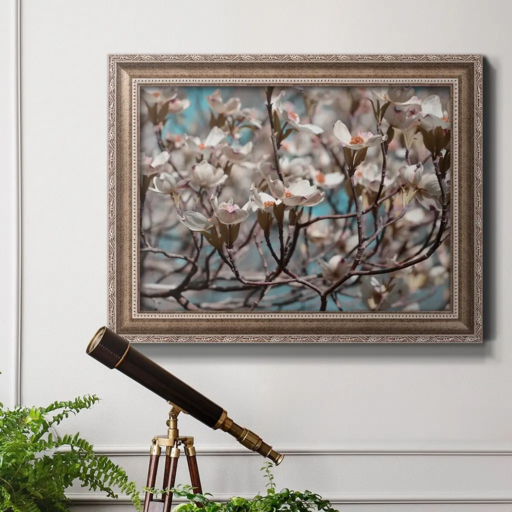 Dogwood Spring I Premium Framed Canvas- Ready to Hang A Premium Framed Canvas created to last. Framed in distressed wood and available in an array of sizes and colors Featuring a beveled a solid wood stretcher bar, each piece comes ready to hand 3 SIZES AVAILABLE 16''X20'' - Overall Size 18'X27'' - Overall Size 24''x36'' - Overall Size Each piece is made to order. Each piece comes with hanging hardware. Made in the USA Ready to Hang Giclee Paper Print Acrylic Glass Beveled Matt Board