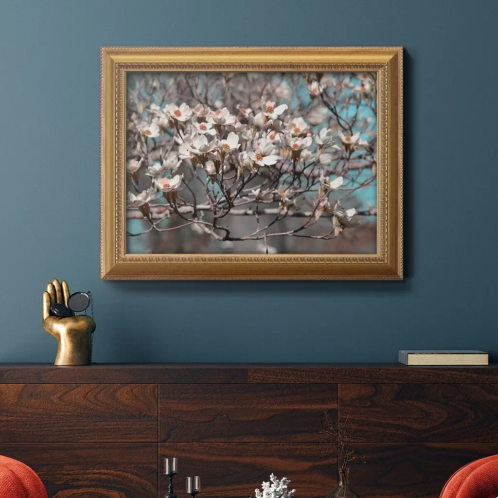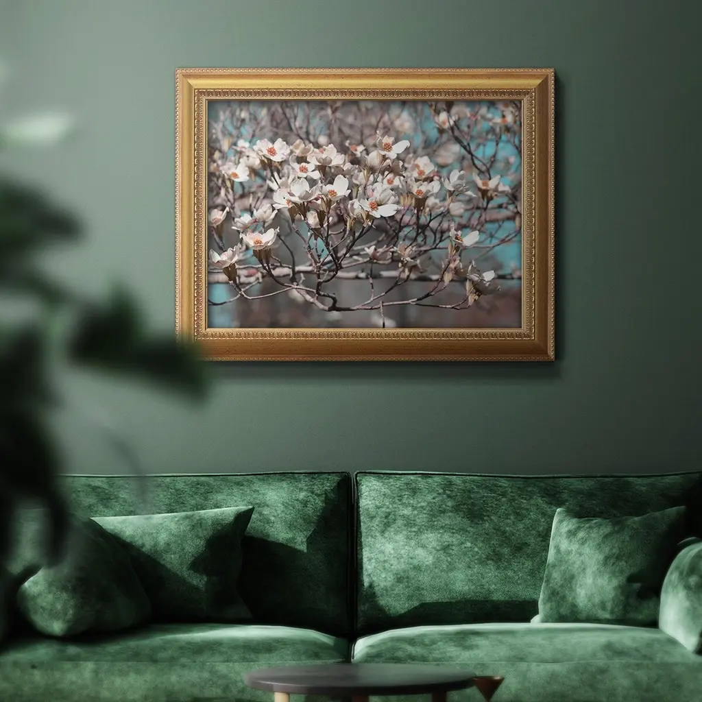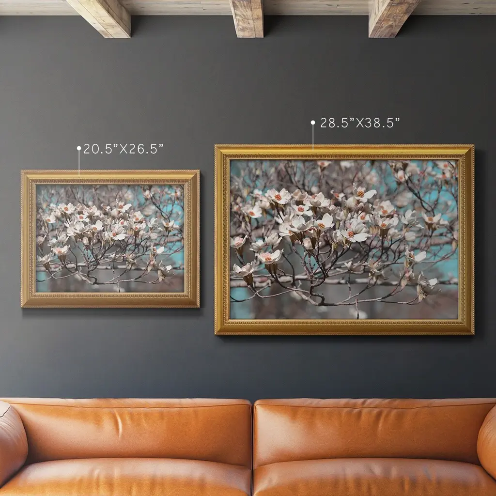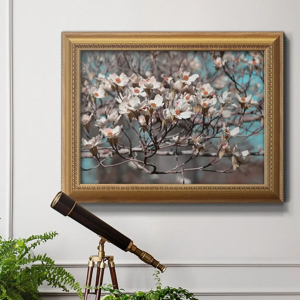 Dogwood Spring II Premium Framed Canvas- Ready to Hang A Premium Framed Canvas created to last. Framed in distressed wood and available in an array of sizes and colors Featuring a beveled a solid wood stretcher bar, each piece comes ready to hand 3 SIZES AVAILABLE 16''X20'' - Overall Size 18'X27'' - Overall Size 24''x36'' - Overall Size Each piece is made to order. Each piece comes with hanging hardware. Made in the USA Ready to Hang Giclee Paper Print Acrylic Glass Beveled Matt Board