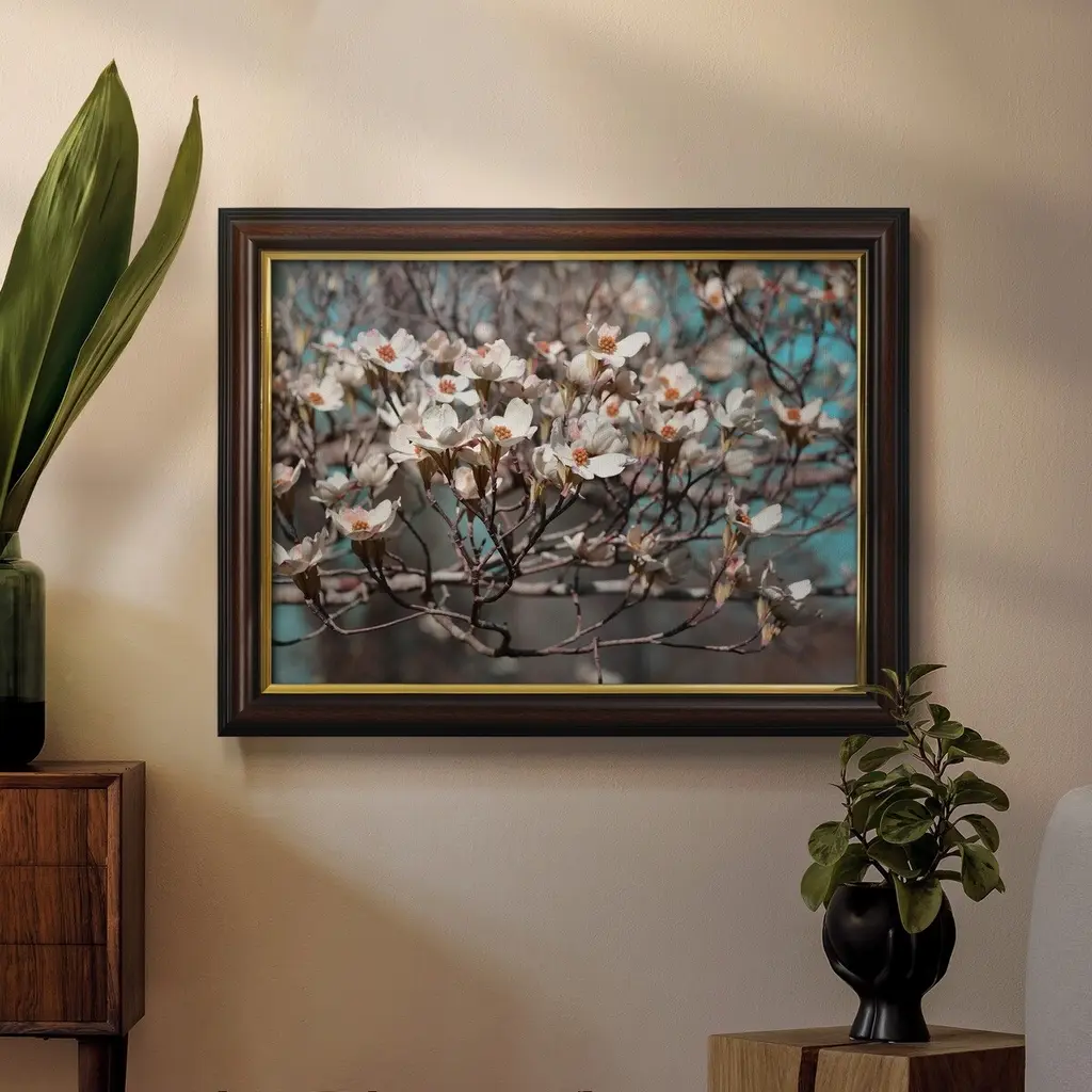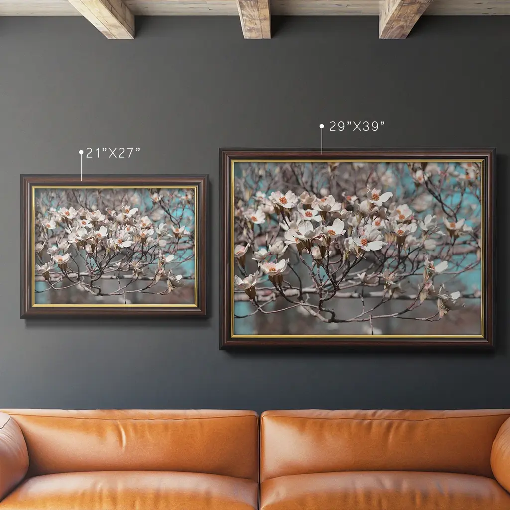 Dogwood Spring II Premium Framed Canvas- Ready to Hang A Premium Framed Canvas created to last. Framed in distressed wood and available in an array of sizes and colors Featuring a beveled a solid wood stretcher bar, each piece comes ready to hand 3 SIZES AVAILABLE 16''X20'' - Overall Size 18'X27'' - Overall Size 24''x36'' - Overall Size Each piece is made to order. Each piece comes with hanging hardware. Made in the USA Ready to Hang Giclee Paper Print Acrylic Glass Beveled Matt Board