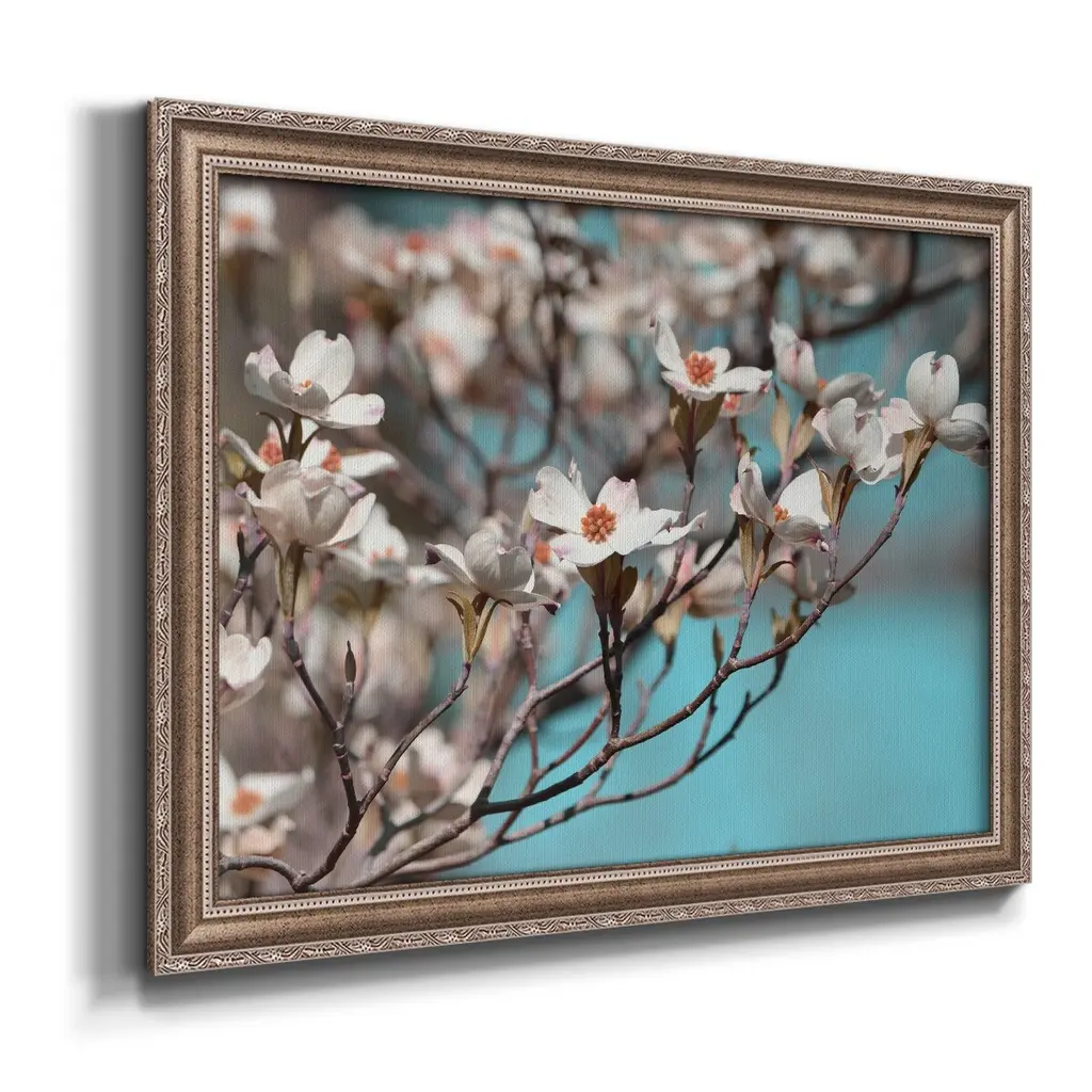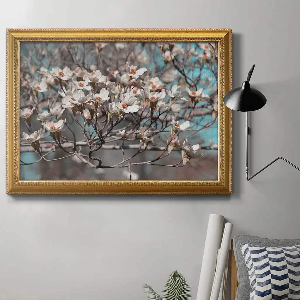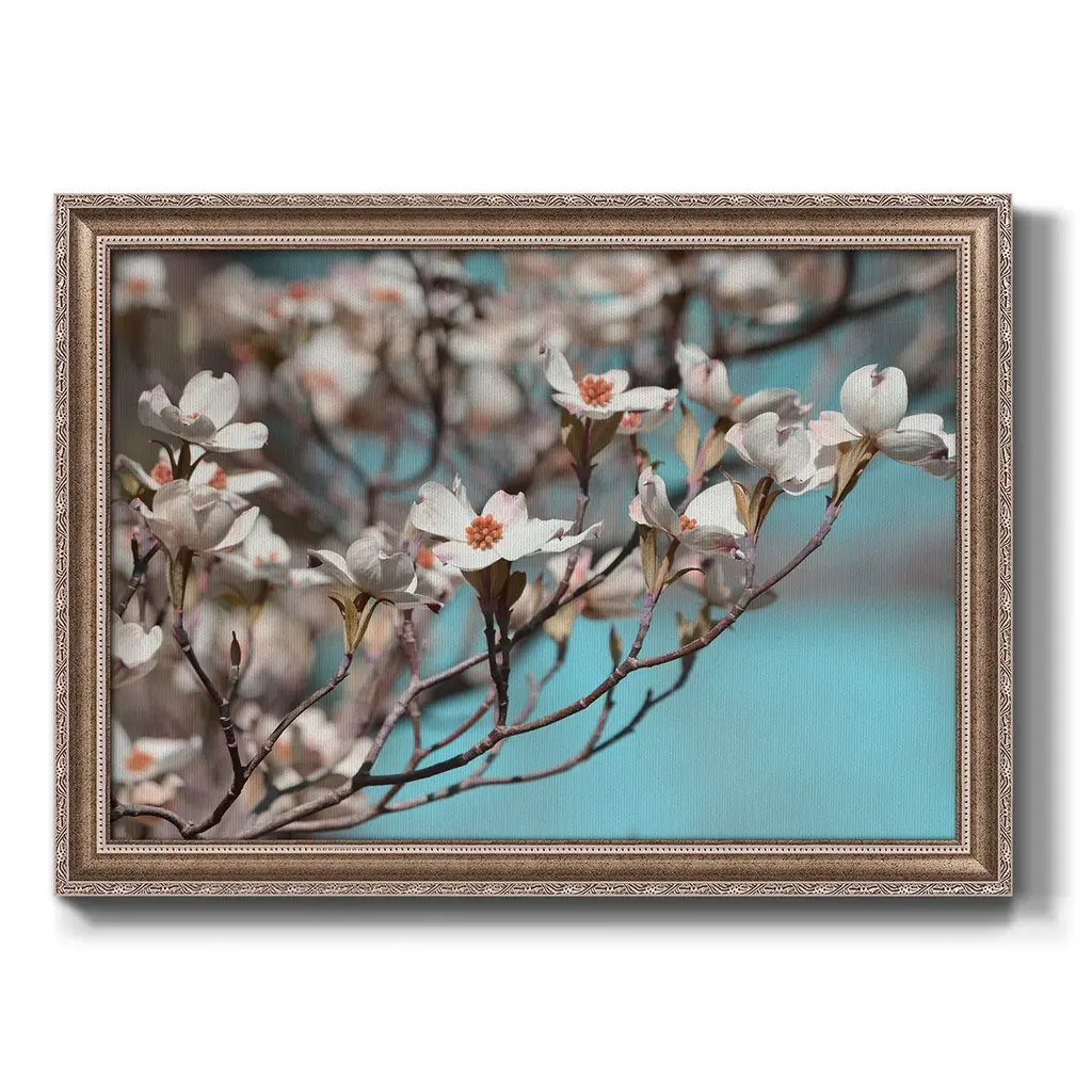 Dogwood Spring III Premium Framed Canvas- Ready to Hang A Premium Framed Canvas created to last. Framed in distressed wood and available in an array of sizes and colors Featuring a beveled a solid wood stretcher bar, each piece comes ready to hand 3 SIZES AVAILABLE 16''X20'' - Overall Size 18'X27'' - Overall Size 24''x36'' - Overall Size Each piece is made to order. Each piece comes with hanging hardware. Made in the USA Ready to Hang Giclee Paper Print Acrylic Glass Beveled Matt Board