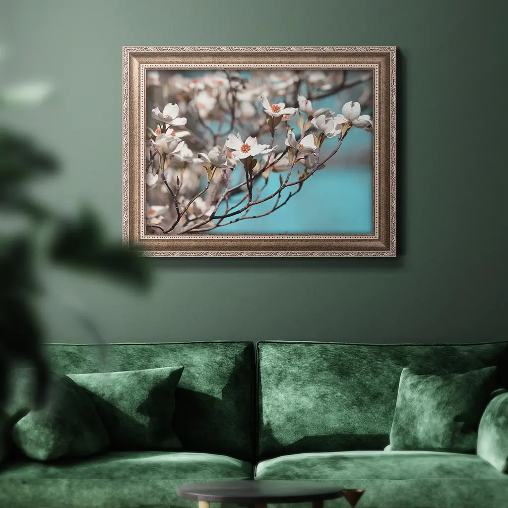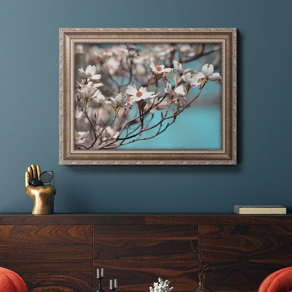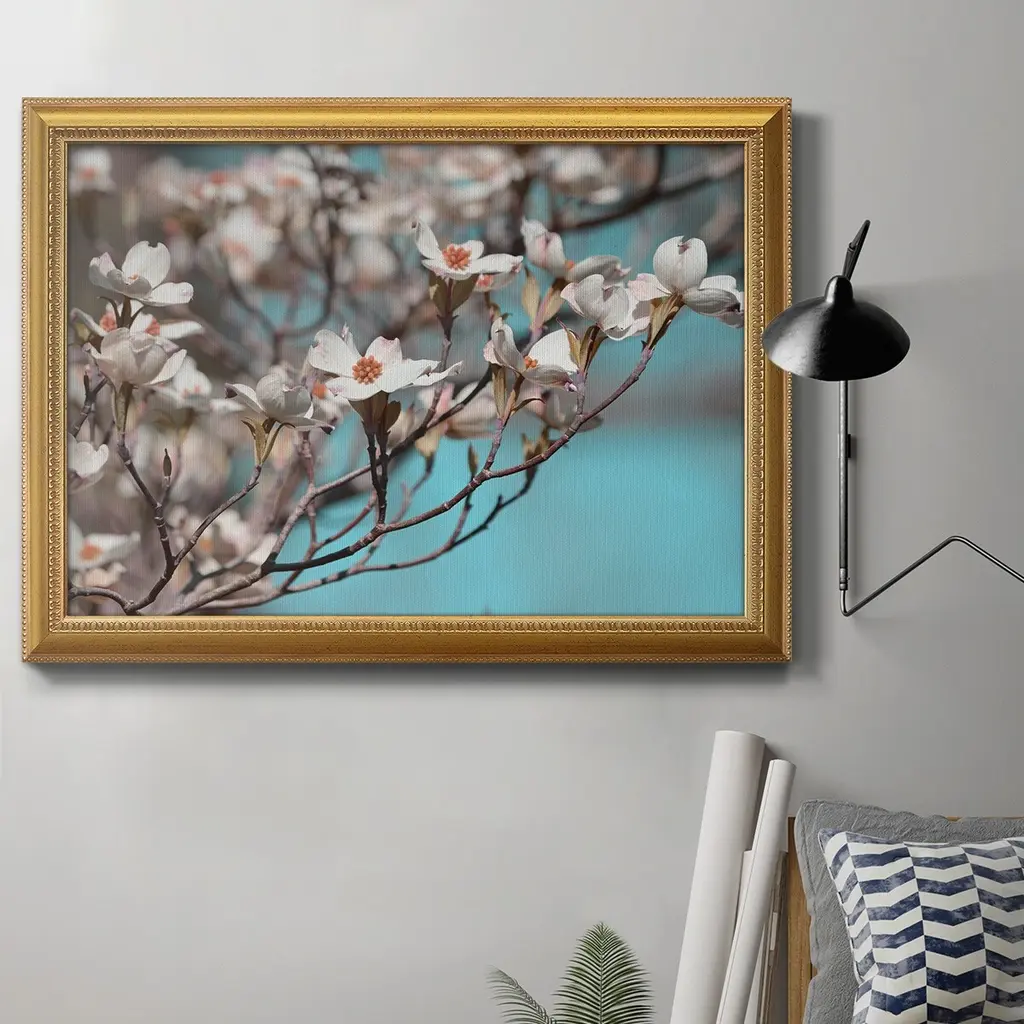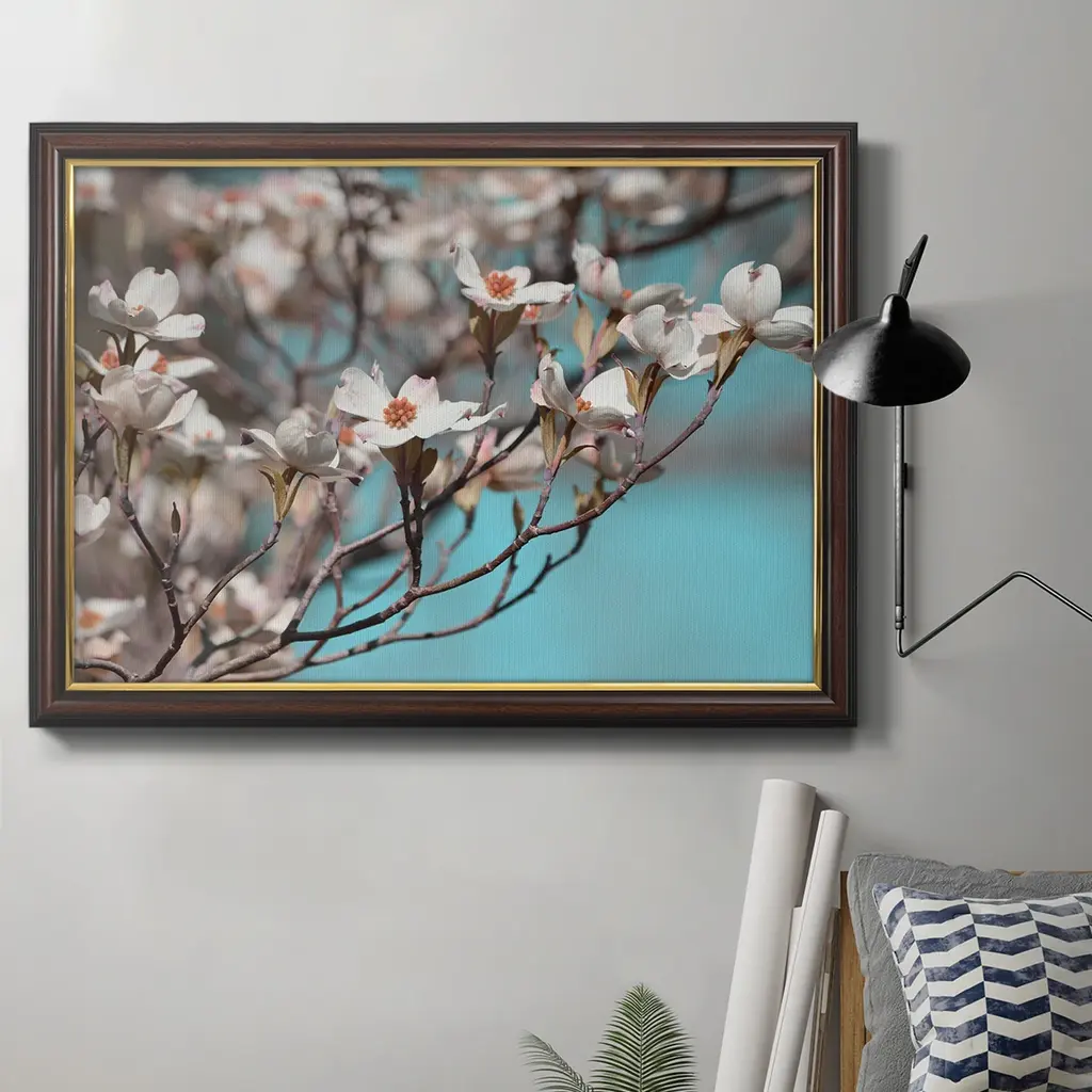Dogwood Spring III Premium Framed Canvas- Ready to Hang A Premium Framed Canvas created to last. Framed in distressed wood and available in an array of sizes and colors Featuring a beveled a solid wood stretcher bar, each piece comes ready to hand 3 SIZES AVAILABLE 16''X20'' - Overall Size 18'X27'' - Overall Size 24''x36'' - Overall Size Each piece is made to order. Each piece comes with hanging hardware. Made in the USA Ready to Hang Giclee Paper Print Acrylic Glass Beveled Matt Board
