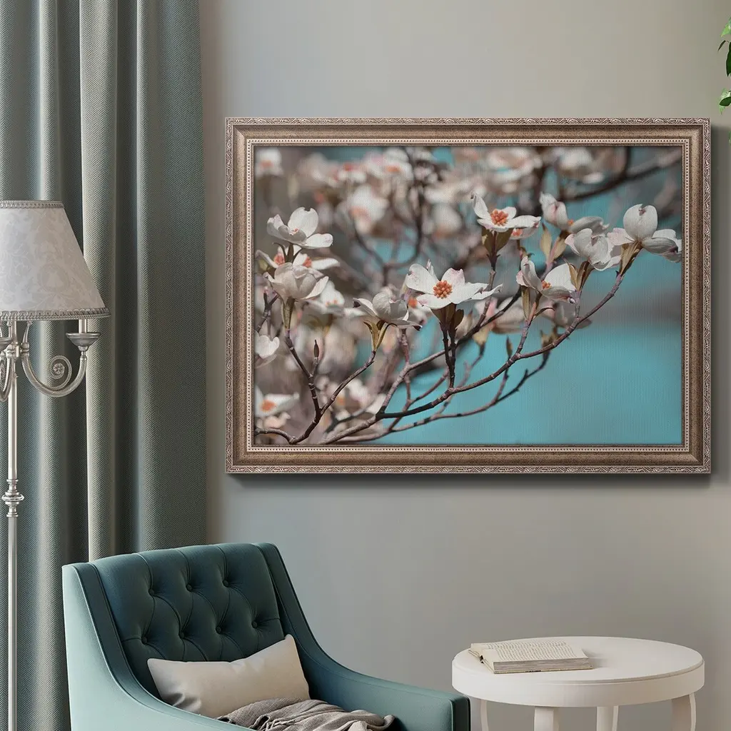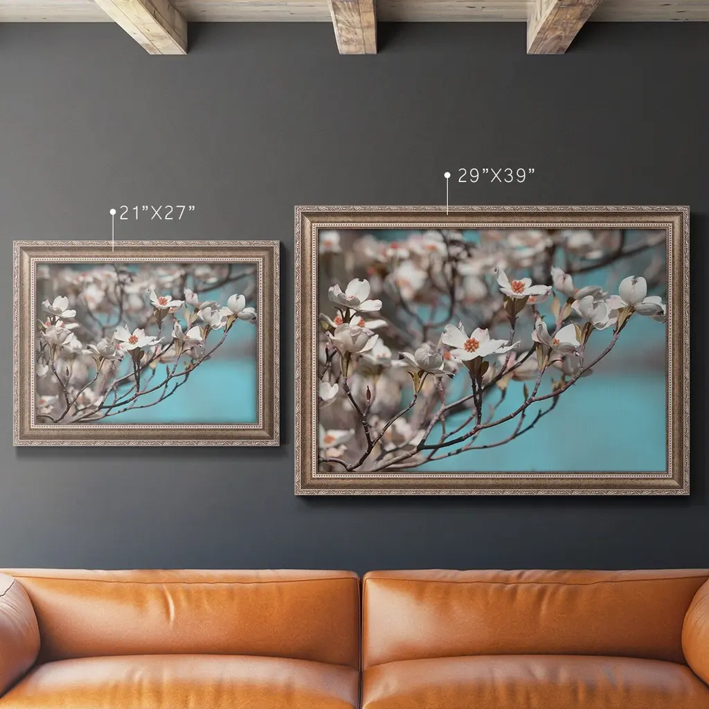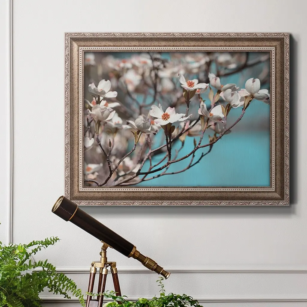 Dogwood Spring III Premium Framed Canvas- Ready to Hang A Premium Framed Canvas created to last. Framed in distressed wood and available in an array of sizes and colors Featuring a beveled a solid wood stretcher bar, each piece comes ready to hand 3 SIZES AVAILABLE 16''X20'' - Overall Size 18'X27'' - Overall Size 24''x36'' - Overall Size Each piece is made to order. Each piece comes with hanging hardware. Made in the USA Ready to Hang Giclee Paper Print Acrylic Glass Beveled Matt Board