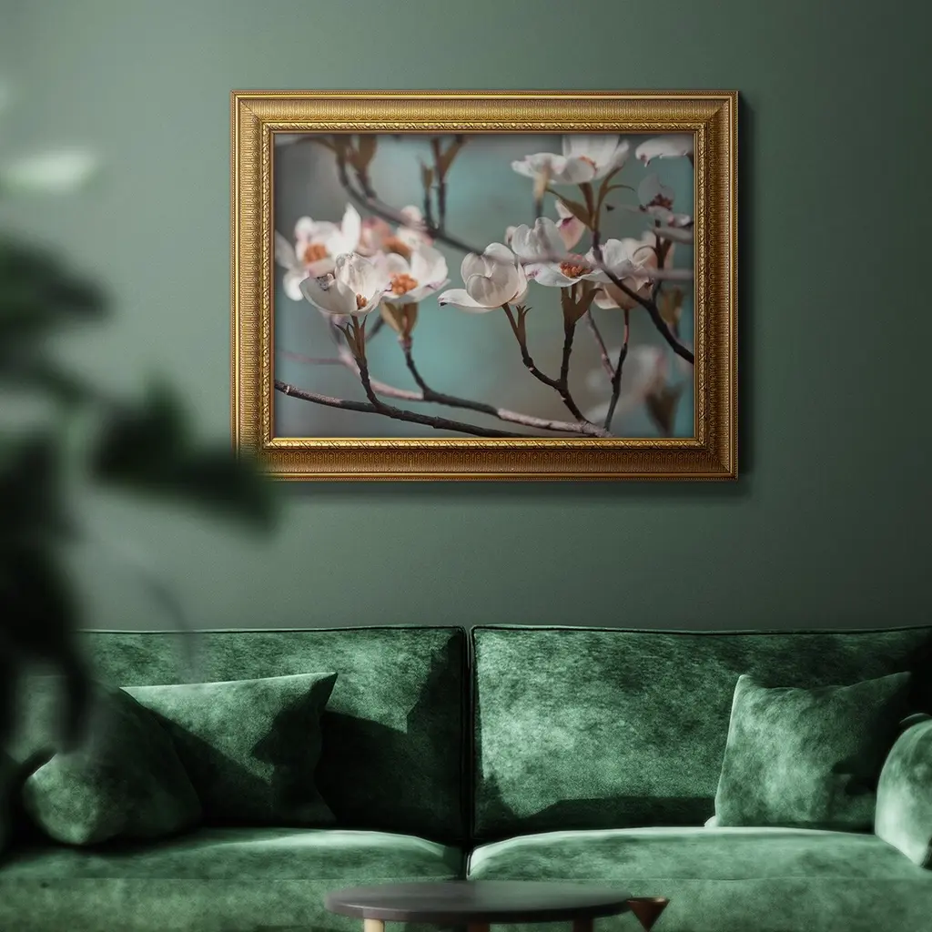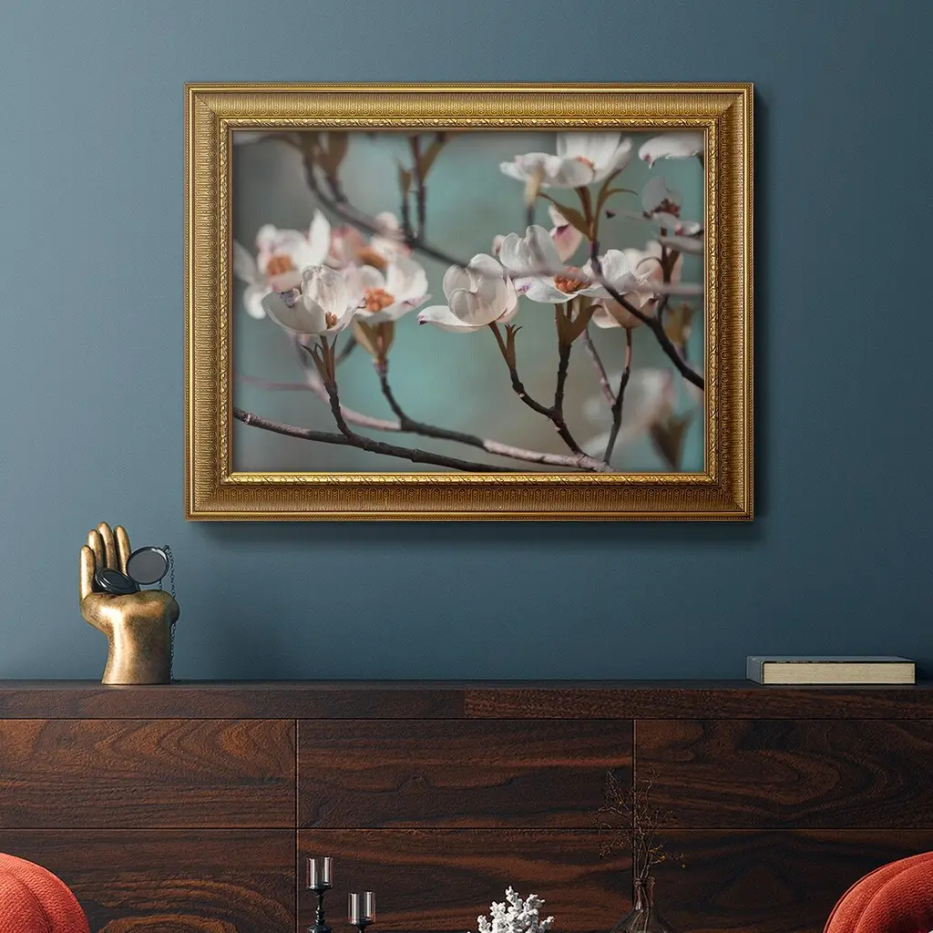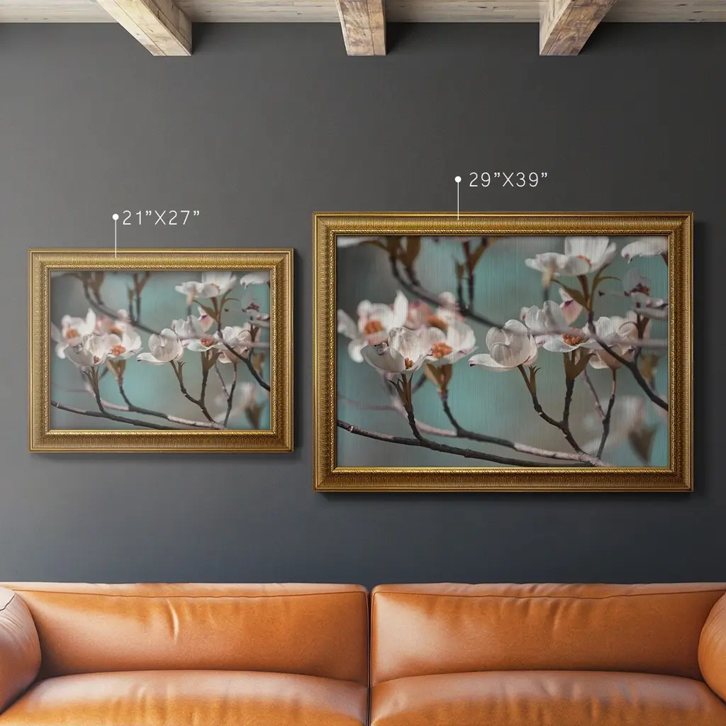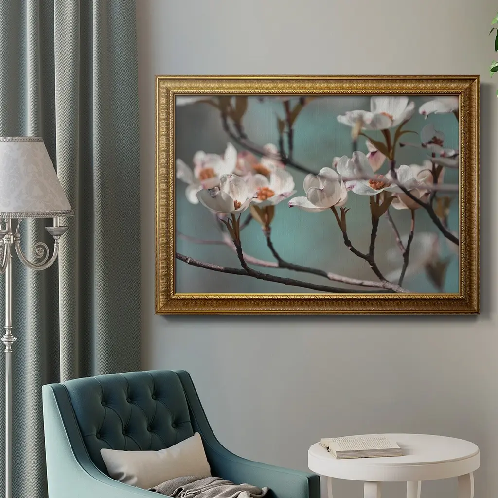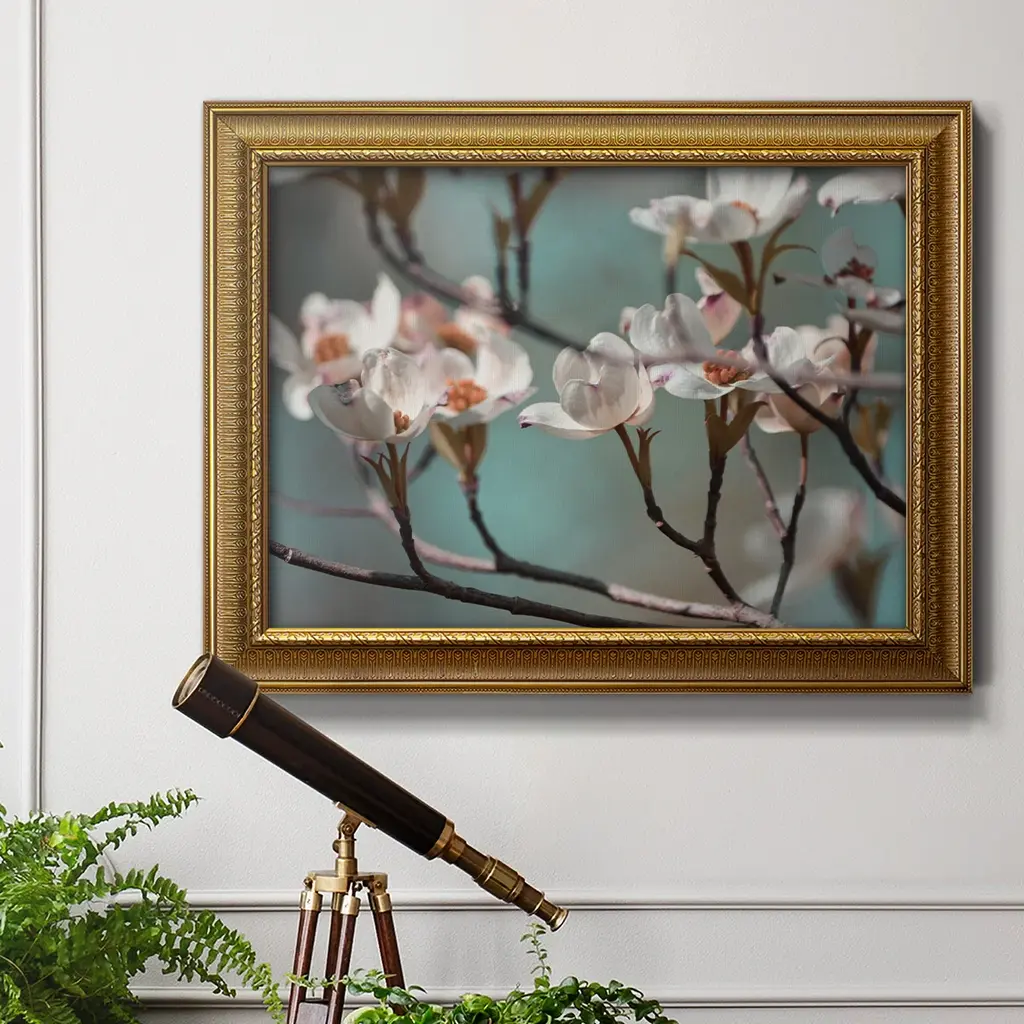 Dogwood Spring IV Premium Framed Canvas- Ready to Hang A Premium Framed Canvas created to last. Framed in distressed wood and available in an array of sizes and colors Featuring a beveled a solid wood stretcher bar, each piece comes ready to hand 3 SIZES AVAILABLE 16''X20'' - Overall Size 18'X27'' - Overall Size 24''x36'' - Overall Size Each piece is made to order. Each piece comes with hanging hardware. Made in the USA Ready to Hang Giclee Paper Print Acrylic Glass Beveled Matt Board