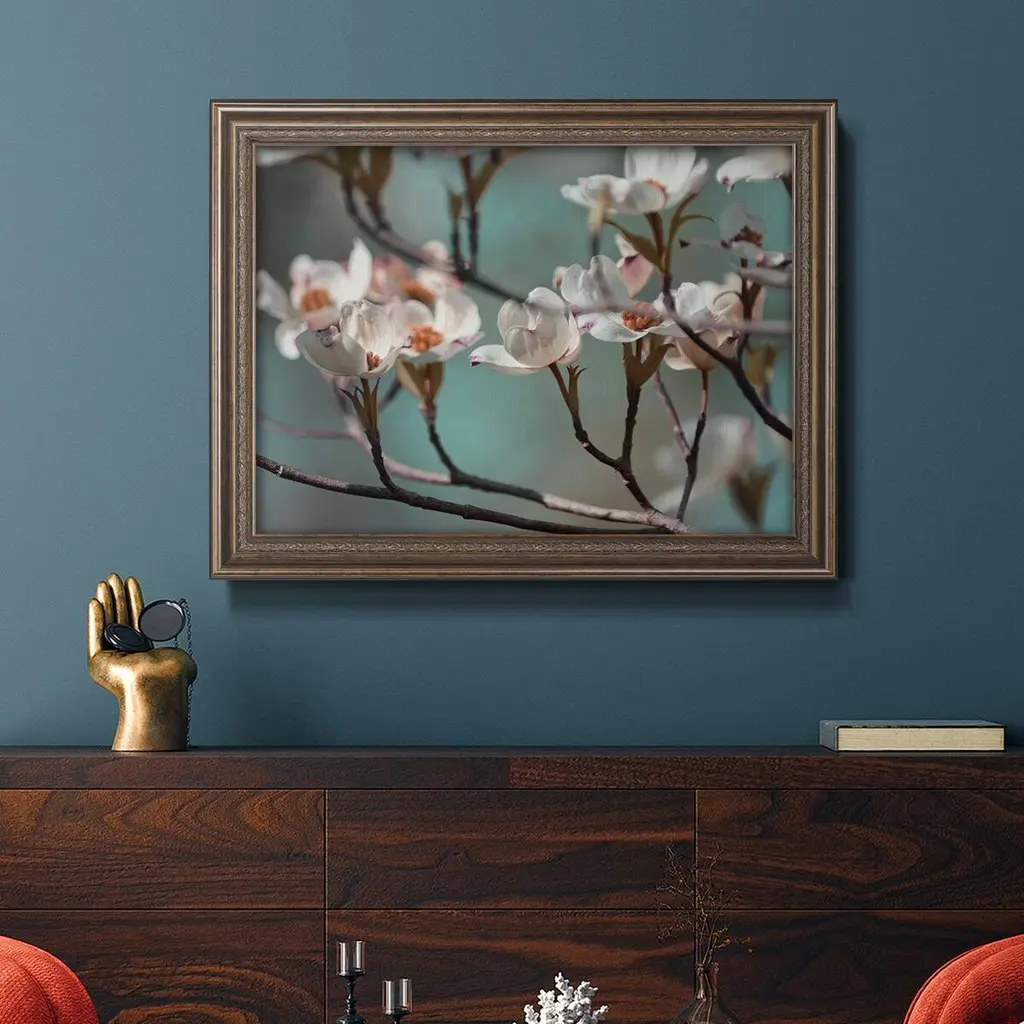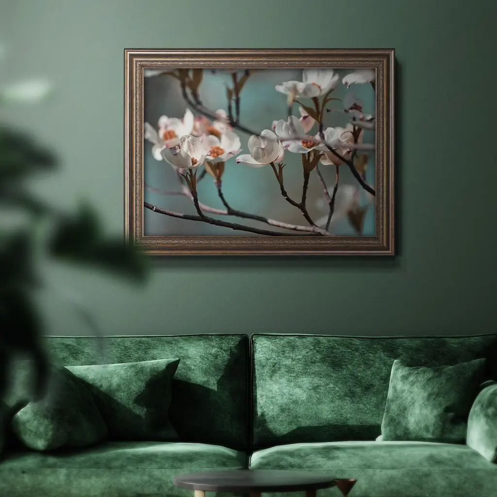Dogwood Spring IV Premium Framed Canvas- Ready to Hang A Premium Framed Canvas created to last. Framed in distressed wood and available in an array of sizes and colors Featuring a beveled a solid wood stretcher bar, each piece comes ready to hand 3 SIZES AVAILABLE 16''X20'' - Overall Size 18'X27'' - Overall Size 24''x36'' - Overall Size Each piece is made to order. Each piece comes with hanging hardware. Made in the USA Ready to Hang Giclee Paper Print Acrylic Glass Beveled Matt Board