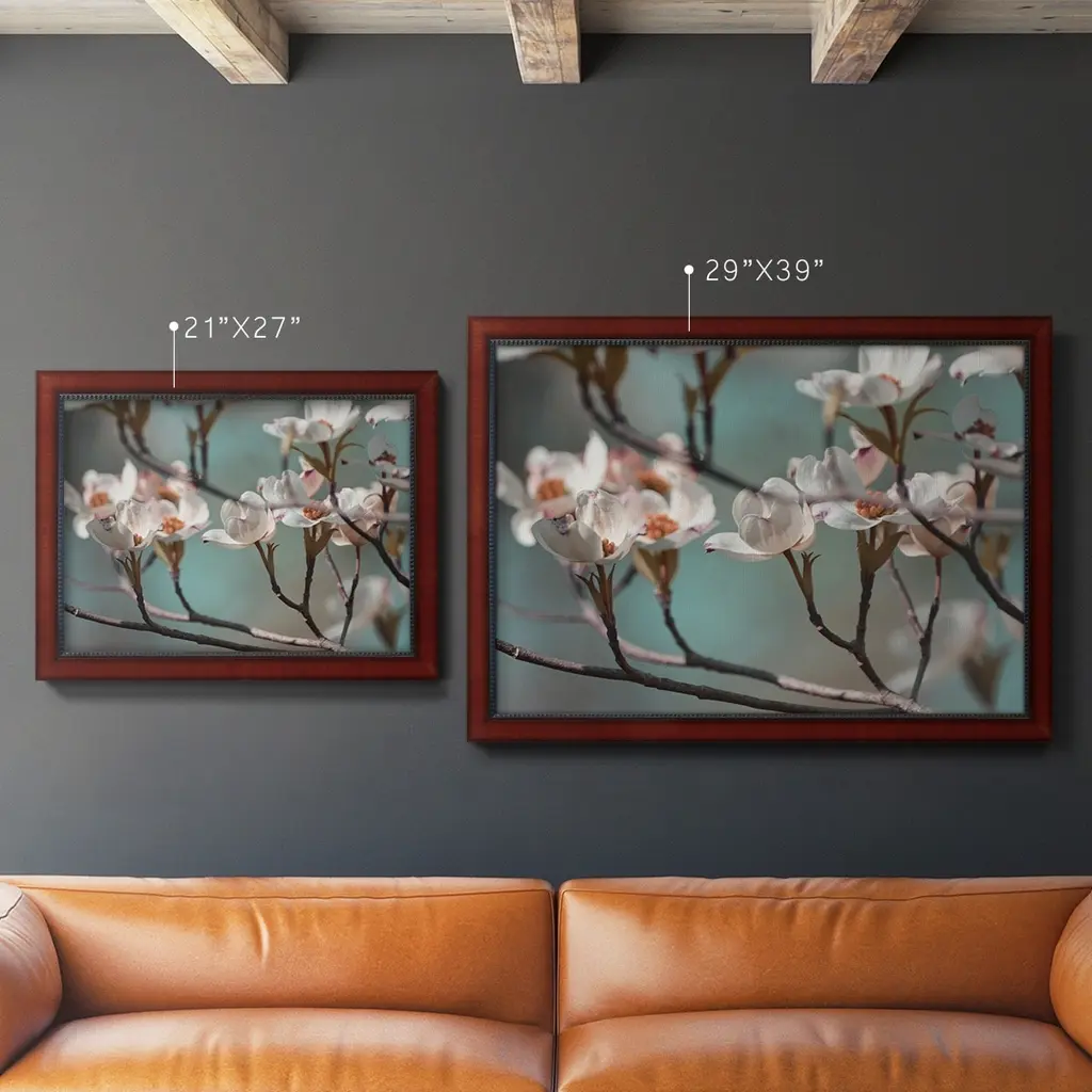 Dogwood Spring IV Premium Framed Canvas- Ready to Hang A Premium Framed Canvas created to last. Framed in distressed wood and available in an array of sizes and colors Featuring a beveled a solid wood stretcher bar, each piece comes ready to hand 3 SIZES AVAILABLE 16''X20'' - Overall Size 18'X27'' - Overall Size 24''x36'' - Overall Size Each piece is made to order. Each piece comes with hanging hardware. Made in the USA Ready to Hang Giclee Paper Print Acrylic Glass Beveled Matt Board