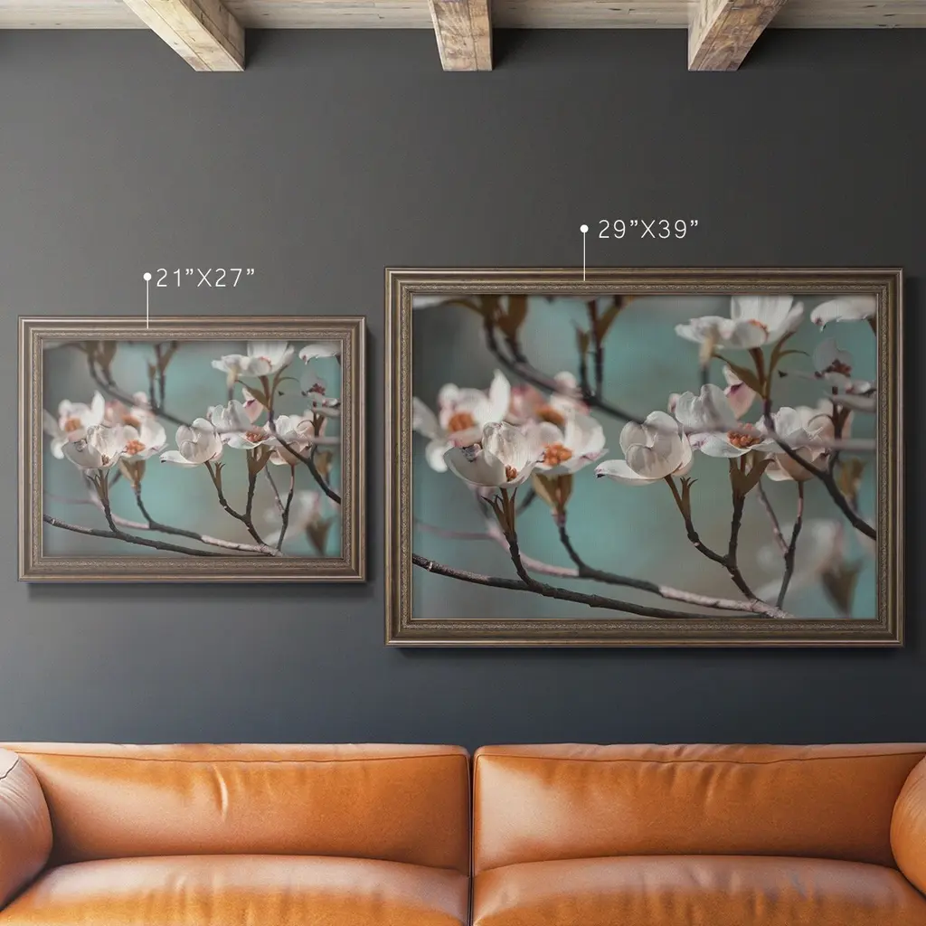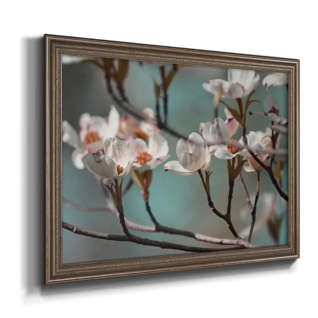 Dogwood Spring IV Premium Framed Canvas- Ready to Hang A Premium Framed Canvas created to last. Framed in distressed wood and available in an array of sizes and colors Featuring a beveled a solid wood stretcher bar, each piece comes ready to hand 3 SIZES AVAILABLE 16''X20'' - Overall Size 18'X27'' - Overall Size 24''x36'' - Overall Size Each piece is made to order. Each piece comes with hanging hardware. Made in the USA Ready to Hang Giclee Paper Print Acrylic Glass Beveled Matt Board