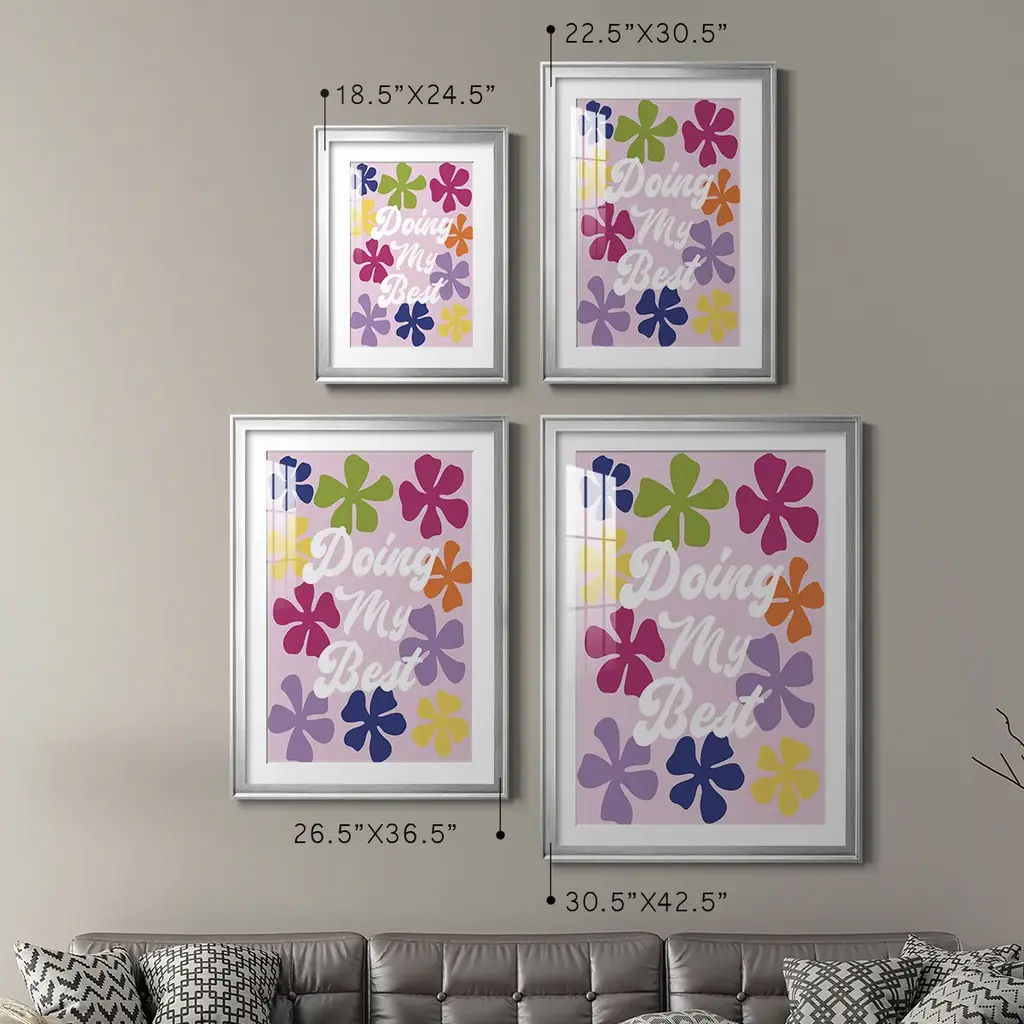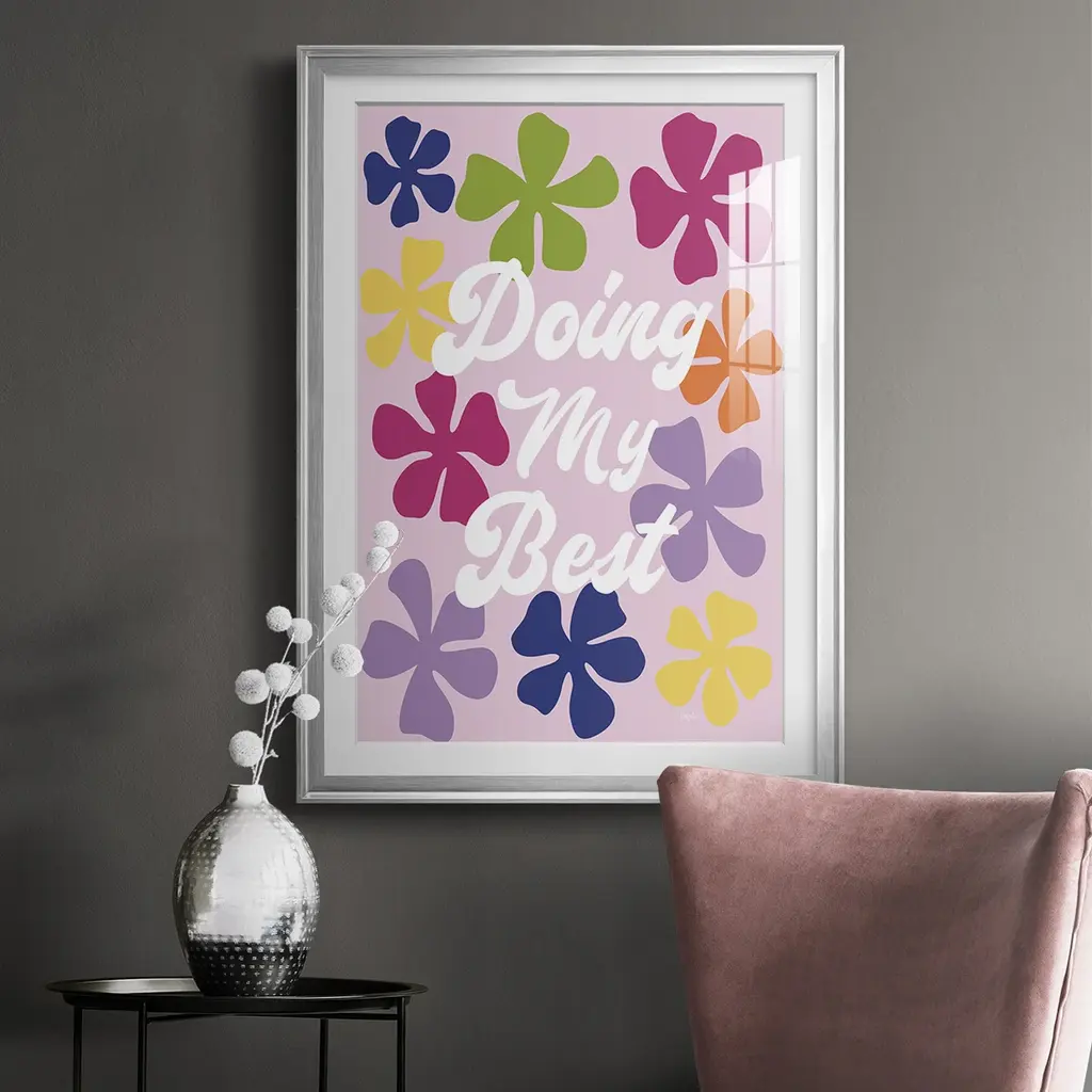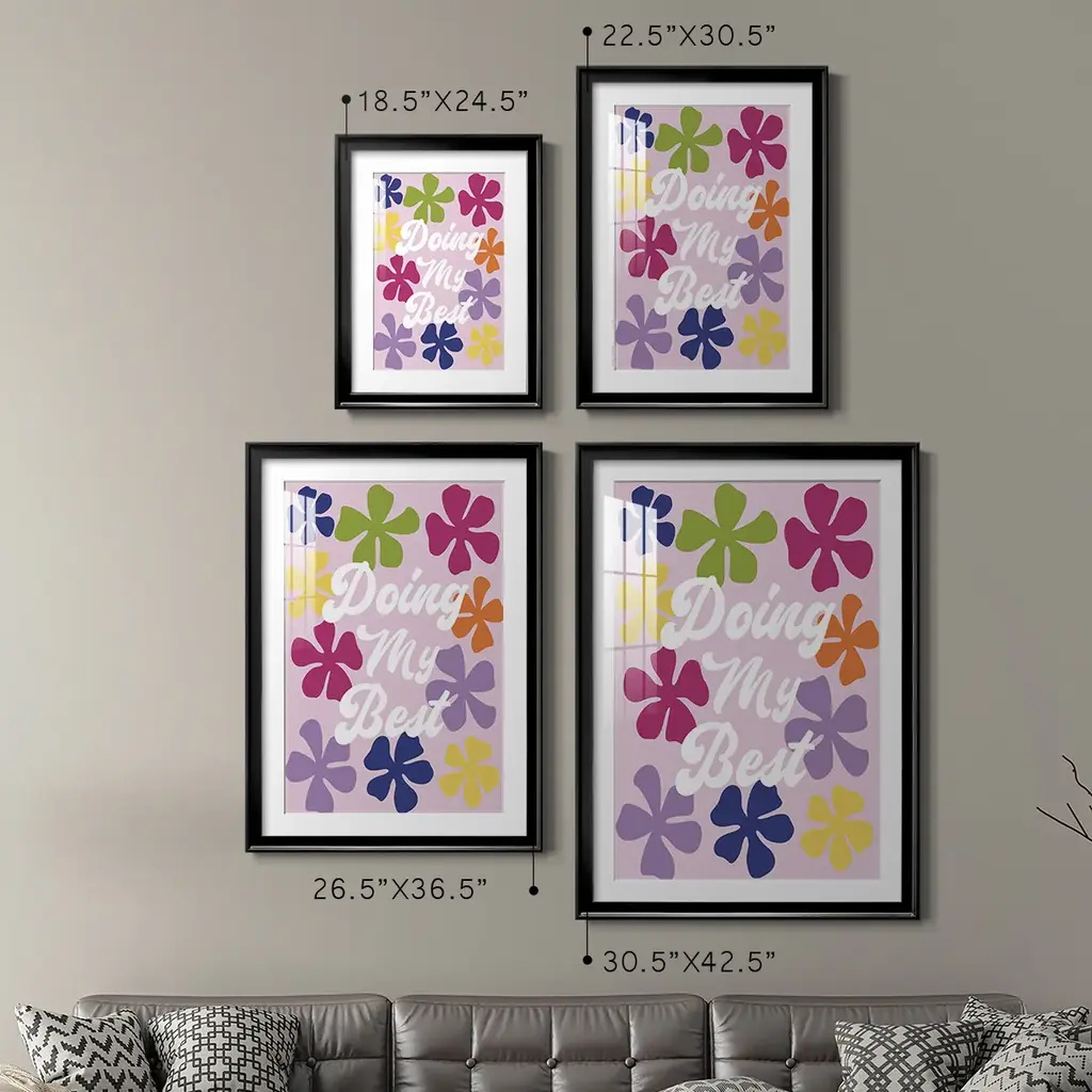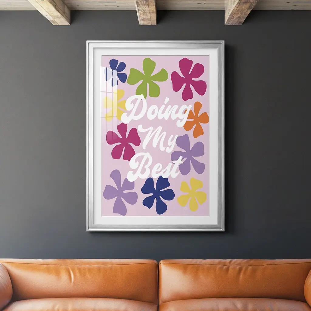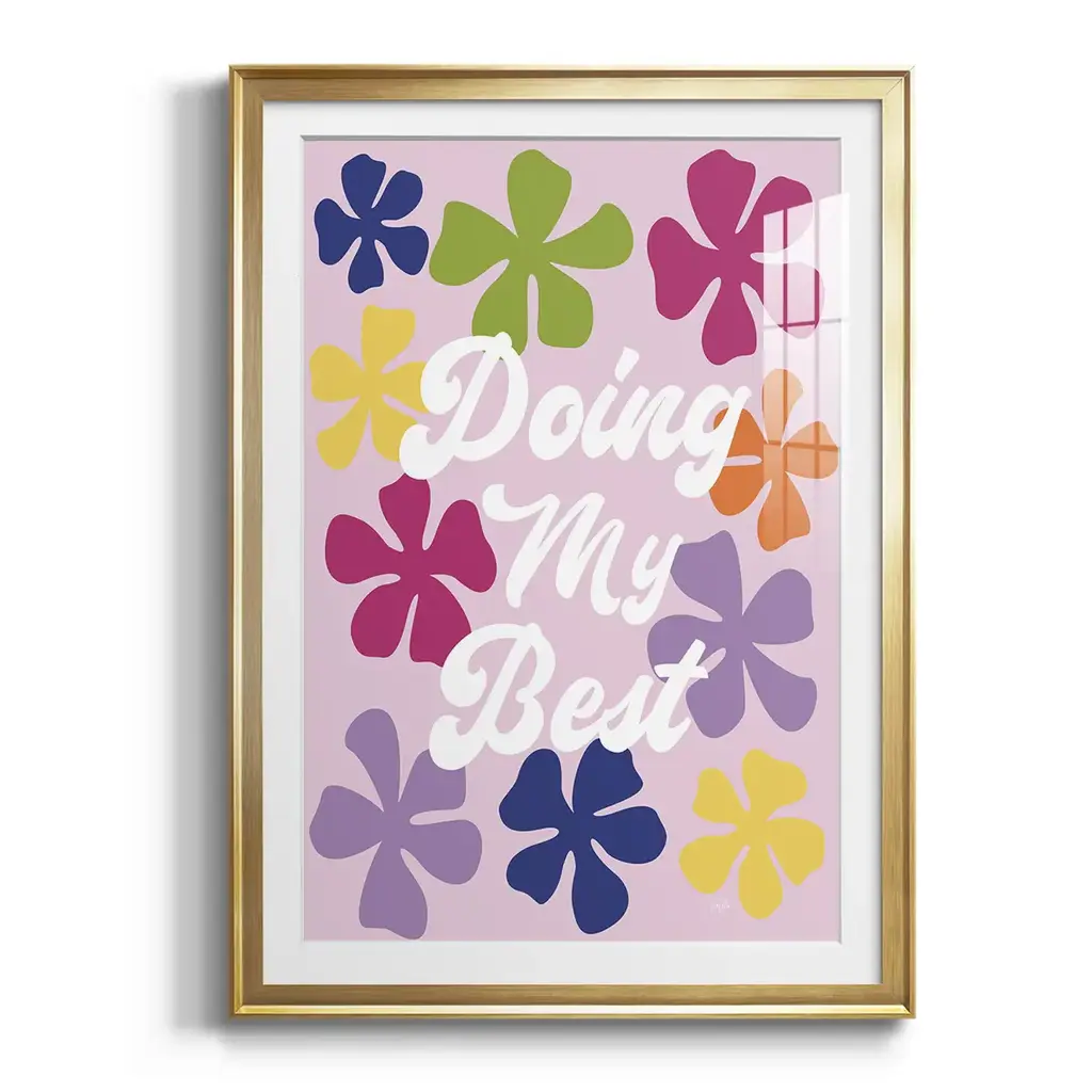 Doing My Best Premium Framed Print - Ready to Hang A Premium Framed Print created to last. Framed in distressed wood and available in an array of sizes and colors Featuring a beveled a solid wood stretcher bar, each piece comes ready to hand 4 SIZES AVAILABLE 30.5''X42.5'' - Overall Size 26.5'X36.5'' - Overall Size 22.5''x30.5'' - Overall Size 18.5''x24.5'' - Overall Size Each piece is made to order. Each piece comes with hanging hardware. Made in the USA Ready to Hang Giclee Paper Print Acrylic Glass Beveled Matt Board