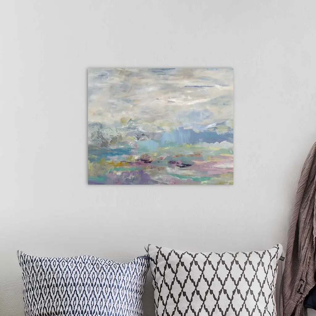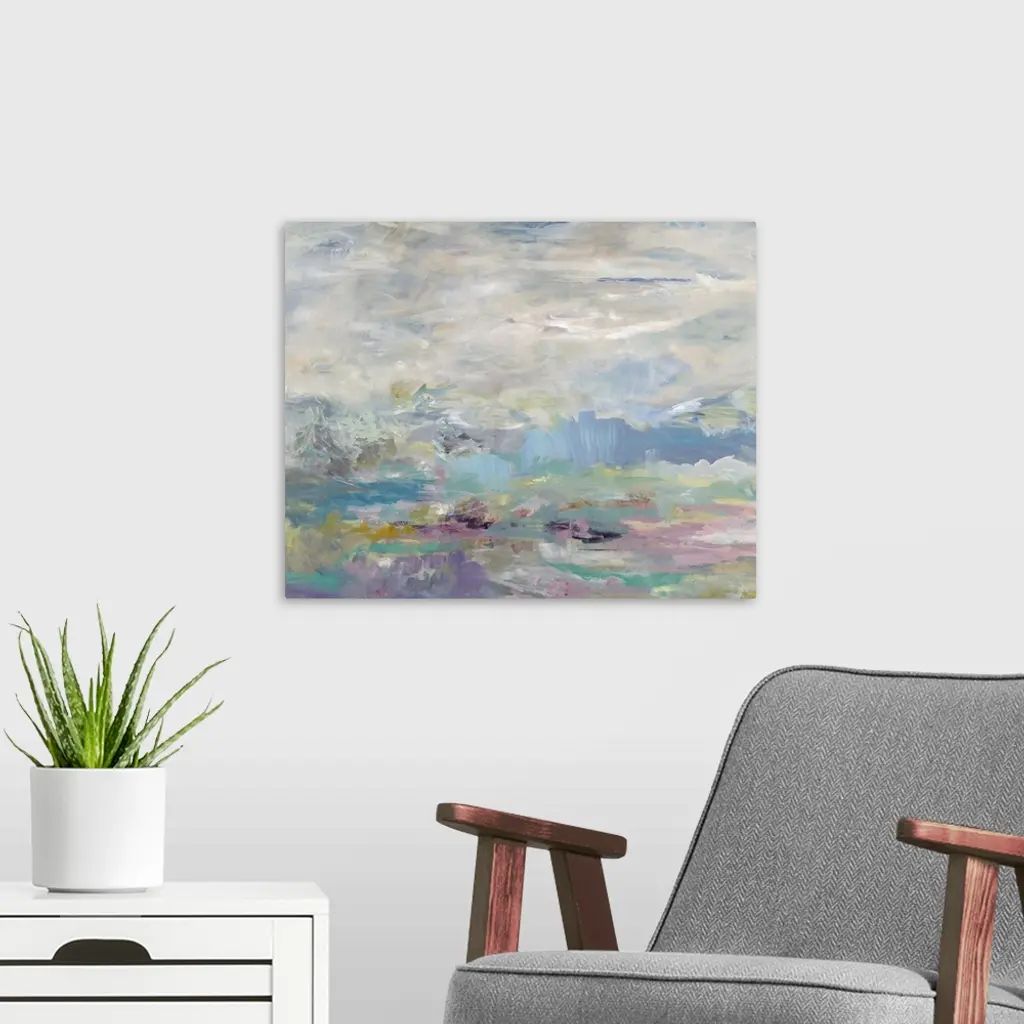 Contemporary abstract painting of what looks like a cloudy sky using pale blue and purple tones.
