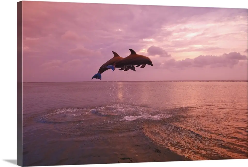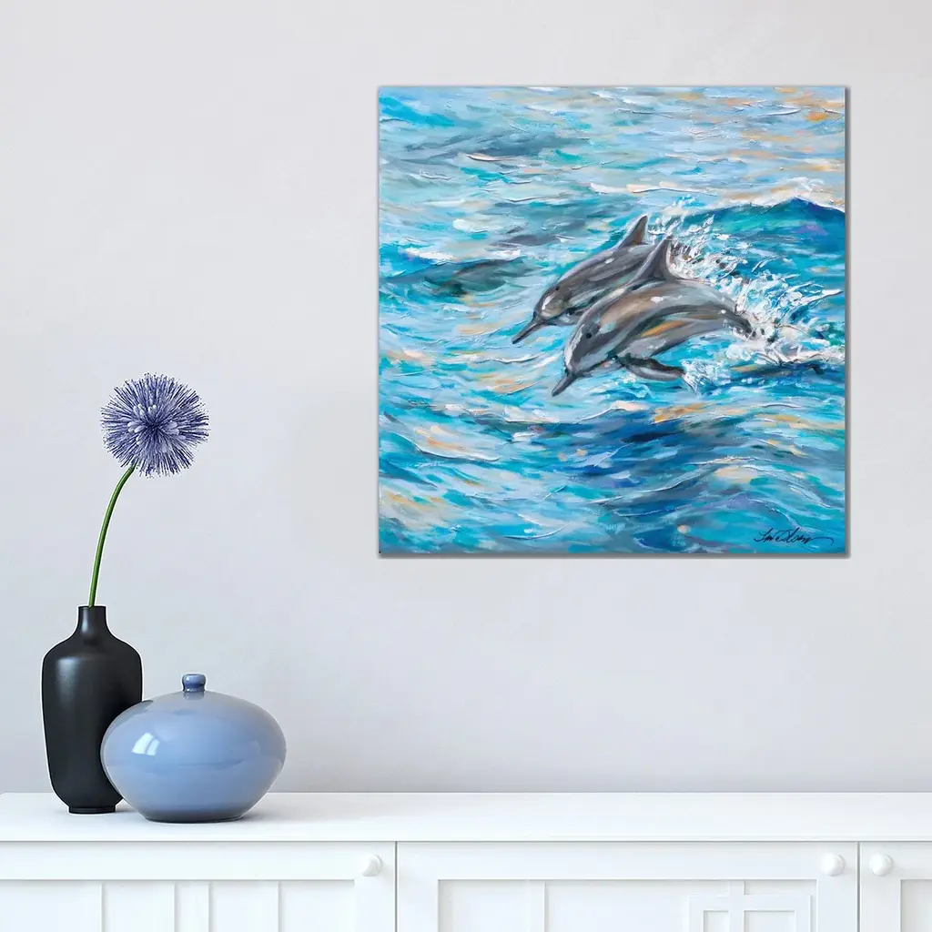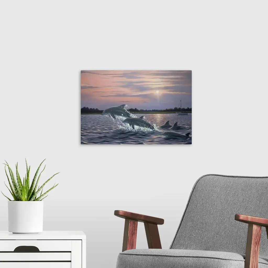 Contemporary artwork of dolphins breaching and leaping out of the water.