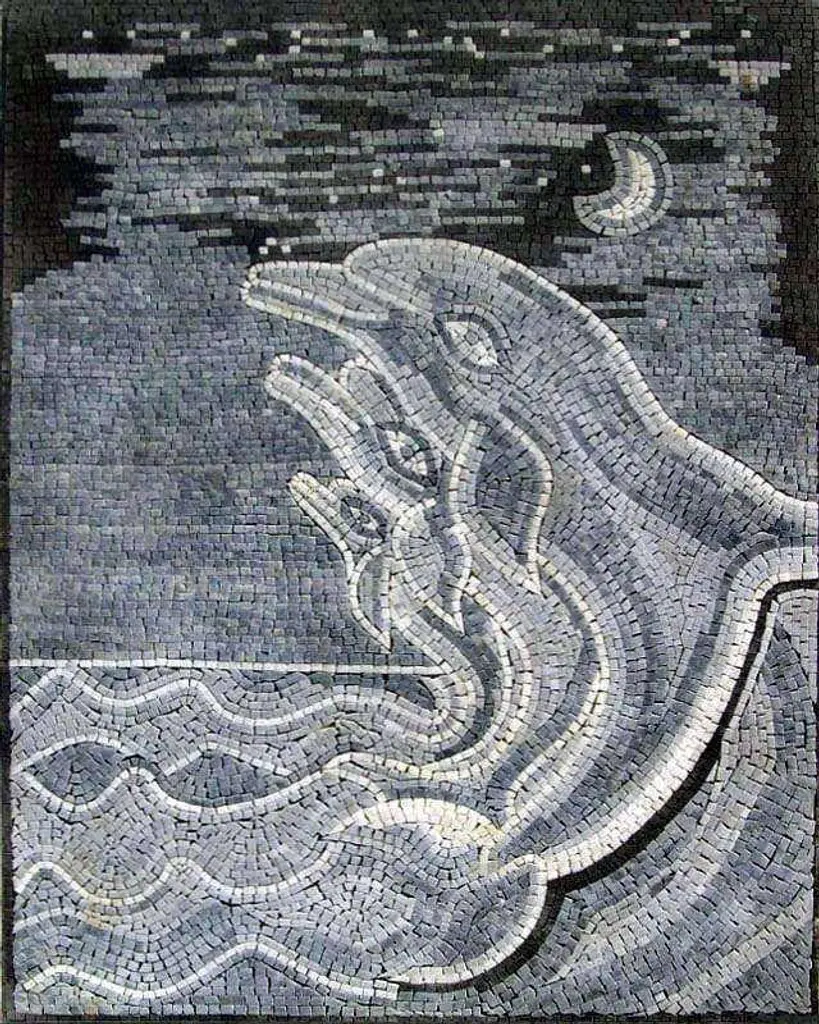 Introducing our stunning "Dolphins Mosaics," a breathtaking piece of art that captures the beauty and grace of these magnificent creatures. This exquisite marble mosaic depicts a pair of dolphins in striking black and white tones, elegantly complemented by subtle shades of gray. Each detail has been meticulously crafted to bring these playful marine mammals to life, creating a captivating visual that will elevate any space.Crafted from 100% natural stones and tiles, our Dolphins Mosaics is not only a testament to exquisite artistry but also a nod to the beauty of nature. The use of natural materials ensures that each piece is unique, with variations in color and texture that highlight the artwork’s individuality. Perfectly suitable for both indoor and outdoor settings, this mosaic serves as an enchanting focal point, whether displayed in a living room, office, or garden.What truly sets our Dolphins Mosaics apart is its artisanal quality. Each piece is fully handmade, signifying the dedication and craftsmanship that goes into its creation. The artisans pour their skill and passion into every mosaic, ensuring that you receive a product that is not just a decoration but a work of art. With its blend of elegance, sophistication, and natural beauty, the Dolphins Mosaics is more than just an ornamental piece; it is a means to express your love for marine life and an opportunity to bring a touch of tranquility into your surroundings. Enhance your home decor with the enchanting imagery of dolphins, evoking feelings of peace and connection with the ocean. This mosaic is not only a reflection of nature’s artistry but also a conversation starter, drawing the admiration of all who encounter it. Make a statement in your space with this unique piece that celebrates the beauty of dolphins and the artistry of handmade craftsmanship. Don't miss the chance to own this remarkable piece - embrace the beauty of the ocean with our Dolphins Mosaics today!