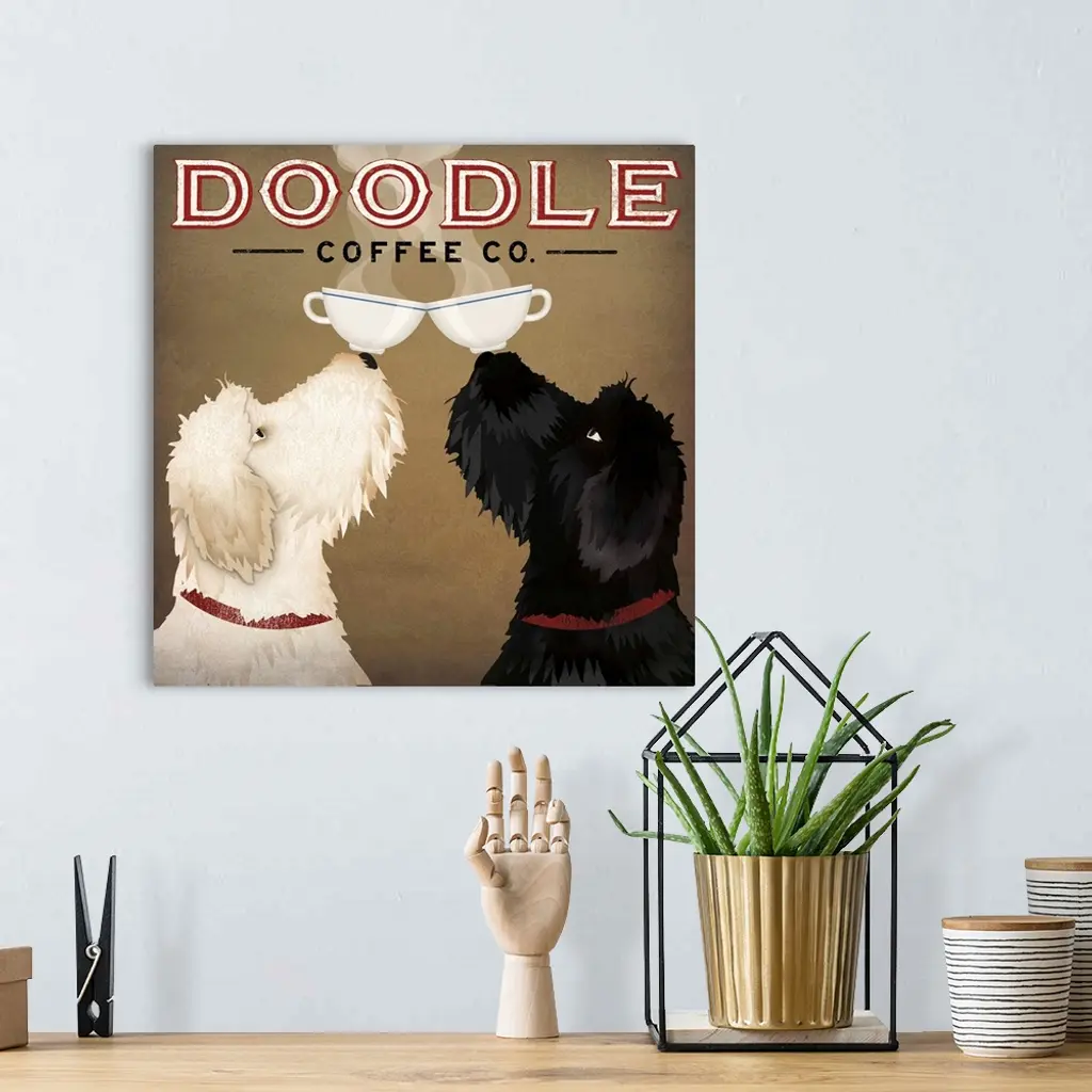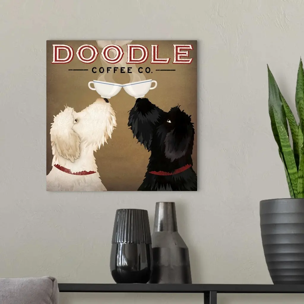 Artwork of black and white goldendoodle dogs balancing cups of coffee on their noses.