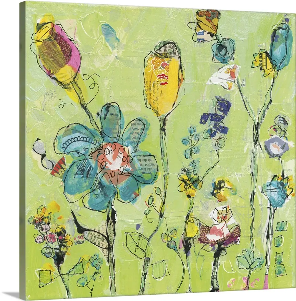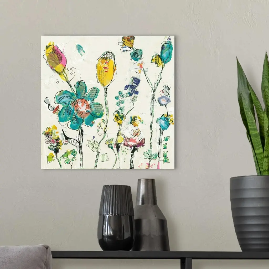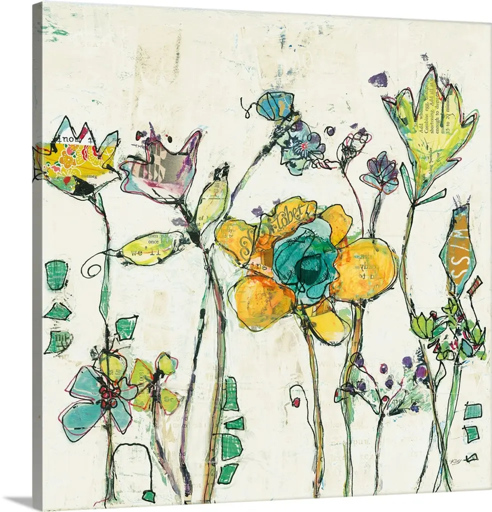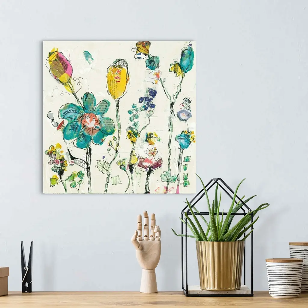 Decorative artwork featuring illustrative flowers that are adorned with cut paper.