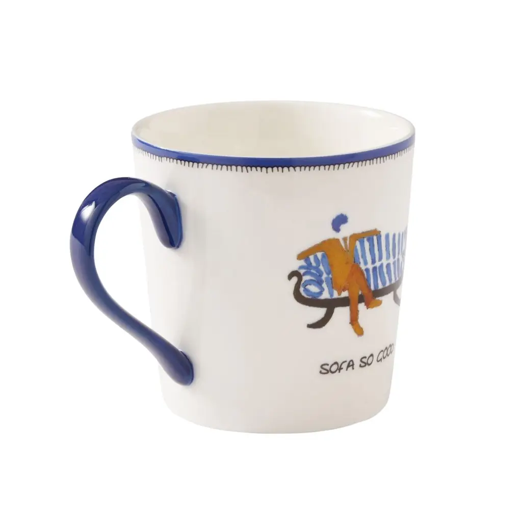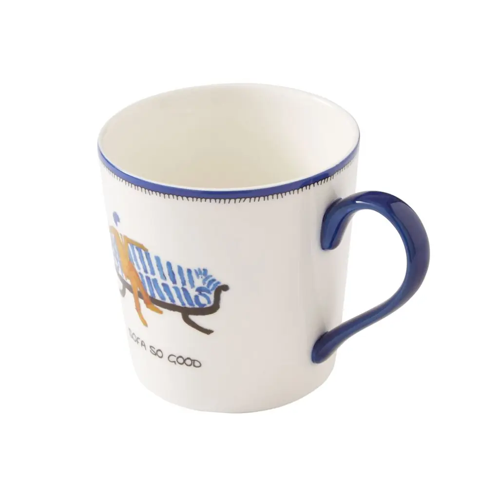 With a striking handle and charming illustration, this fine china mug from the Doodles collection makes a wonderful gift. Designed by Willow Kemp, the painted sketch of a suited man enjoying his sofa is accompanied by the playful tagline, ‘Sofa So Good’. Dishwasher safe, this cup is perfect for everyday use. A wonderful gift for all occasions, gift as a spontaneous treat, thank you, or congratulations.