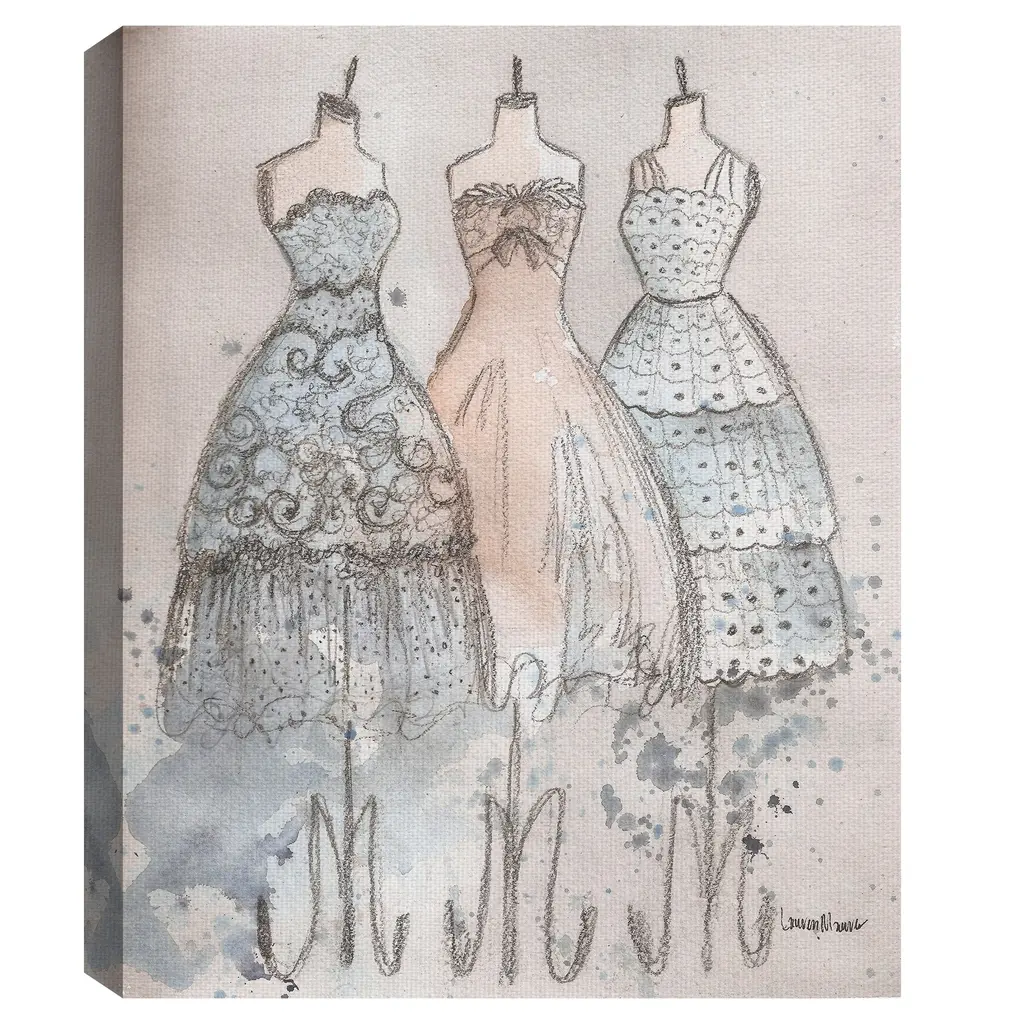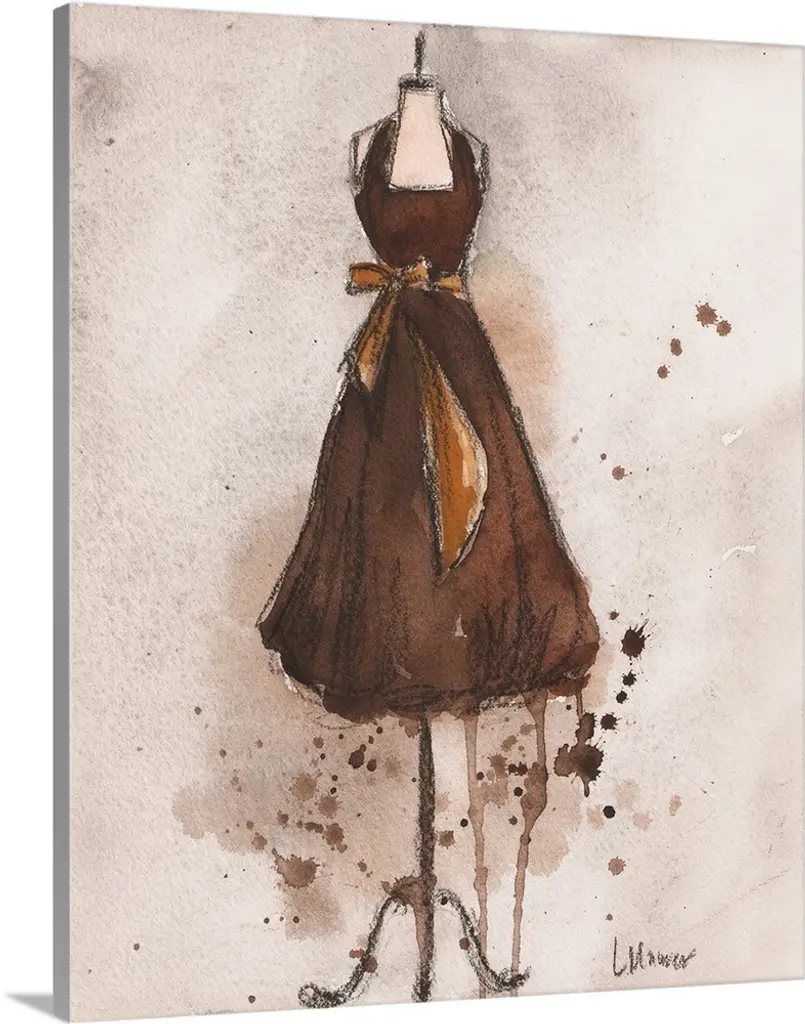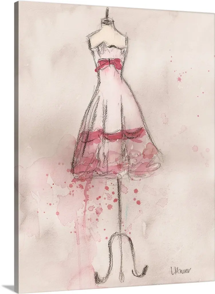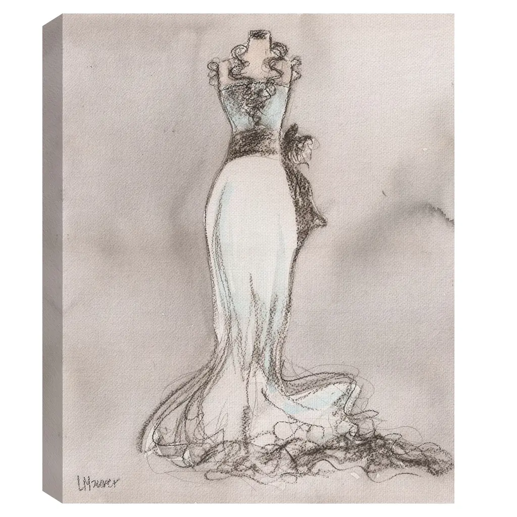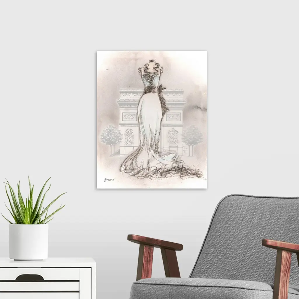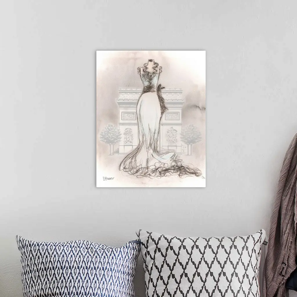 Watercolor painting of a white dress on a dress form, in front of the Arc de Triomphe.