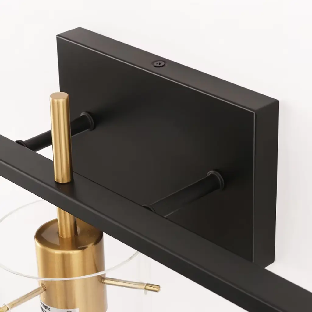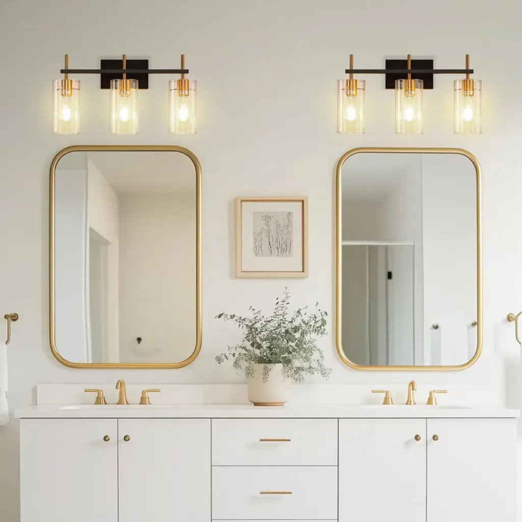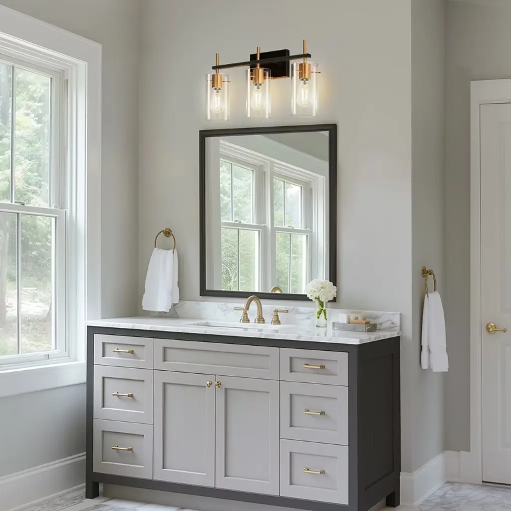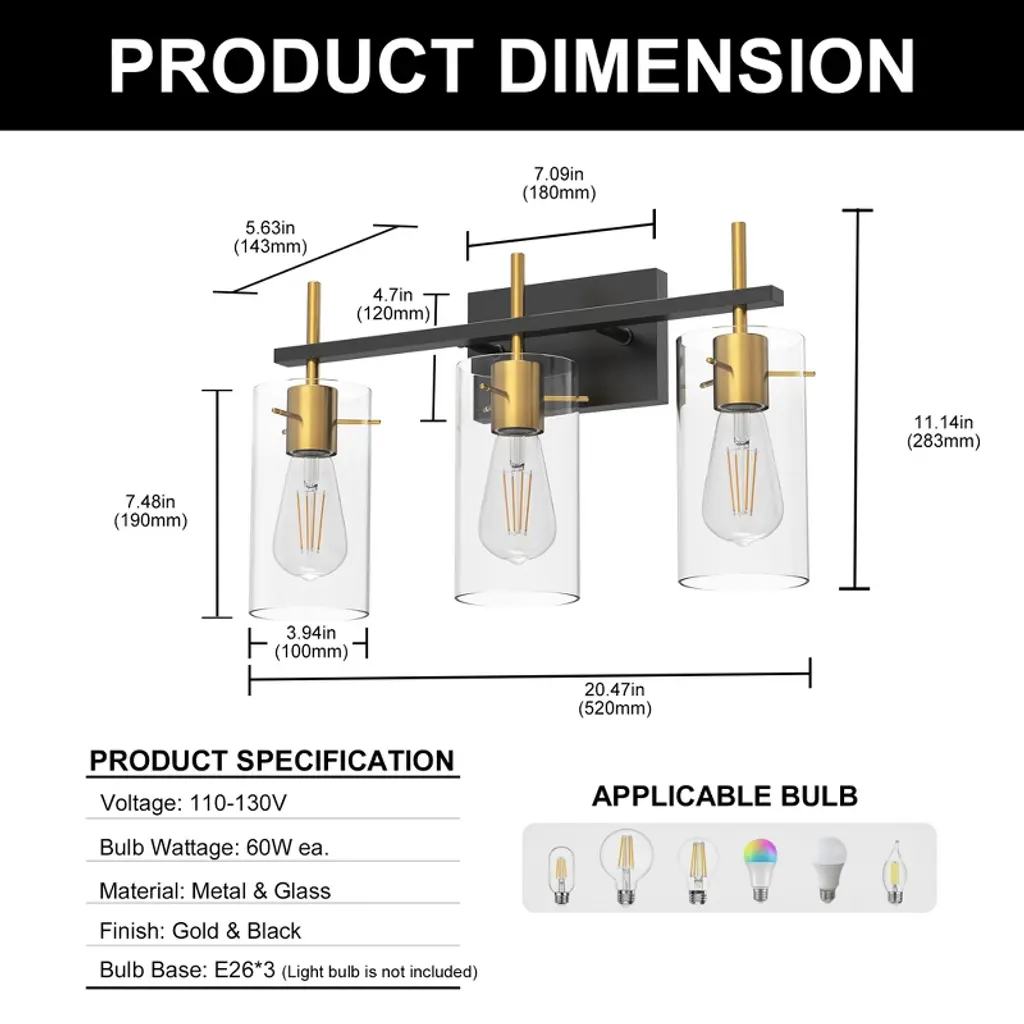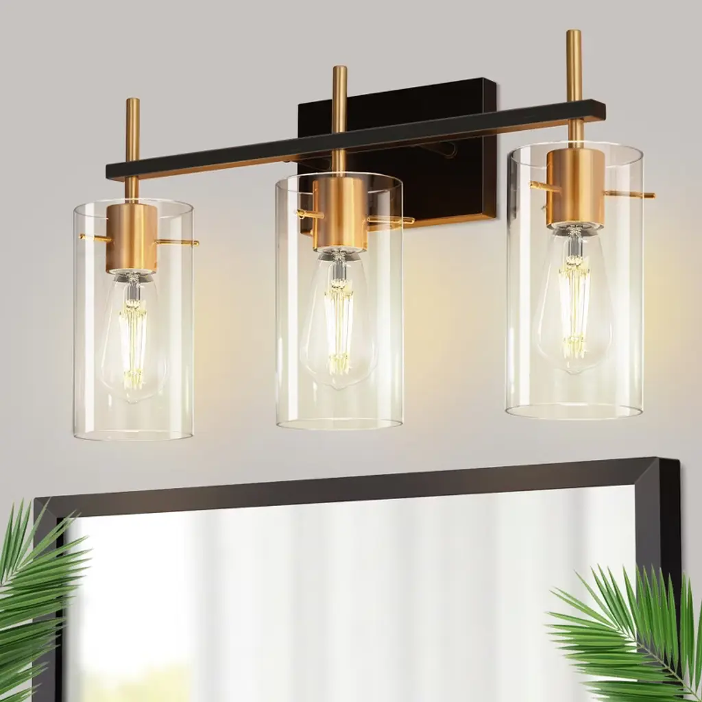 Upgrade your bathroom with this chic 3-light vanity fixture. Featuring a modern Black and Gold metal frame paired with clear glass shades, this fixture combines functionality and style for your vanity area. The clean lines and minimalist design make it an ideal addition to any bathroom, providing bright, efficient lighting while complementing a variety of decor styles.
