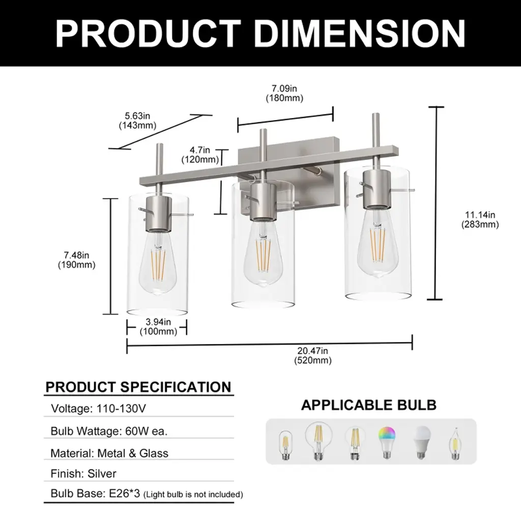 Doresshop 20 In. 3-light Brushed Nickel Bathroom Led Vanity Light With Clear Glass Shades, Modern Lighting Fixture