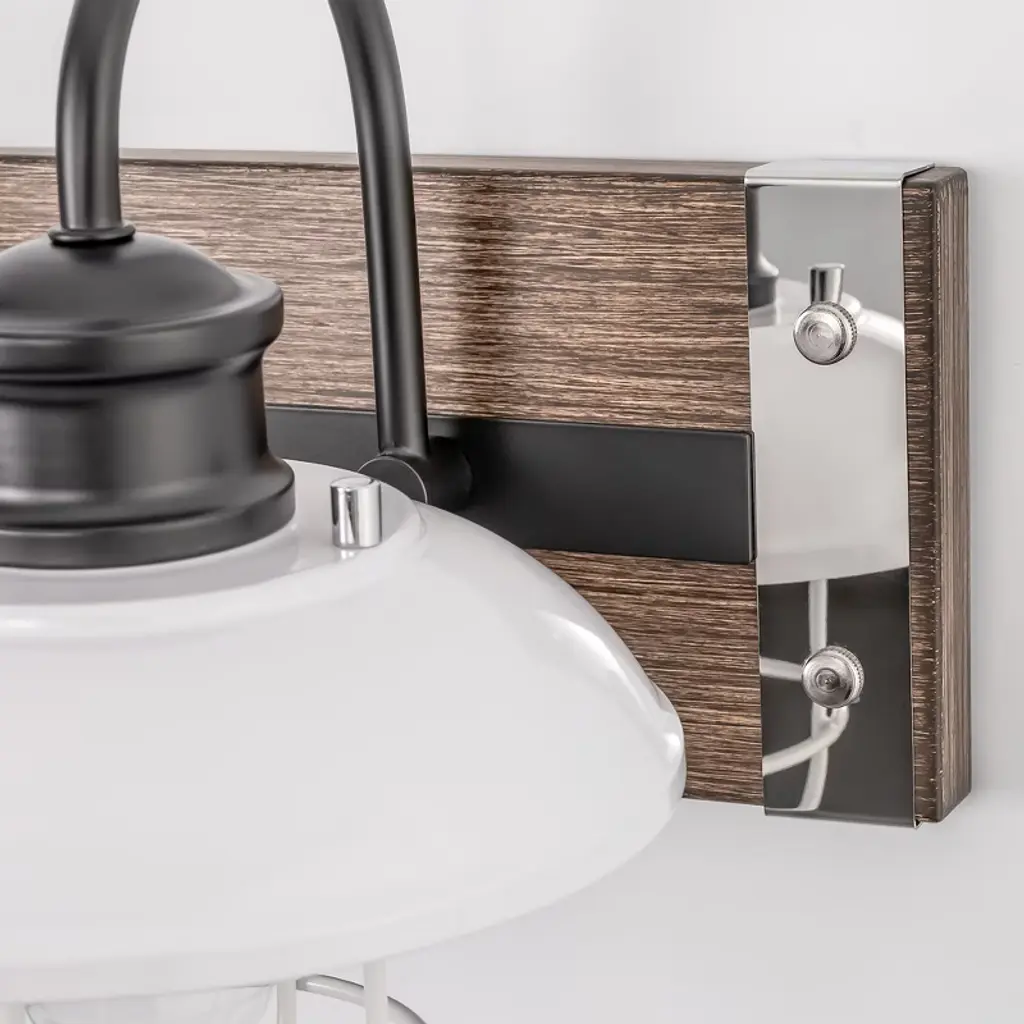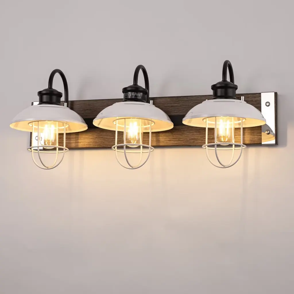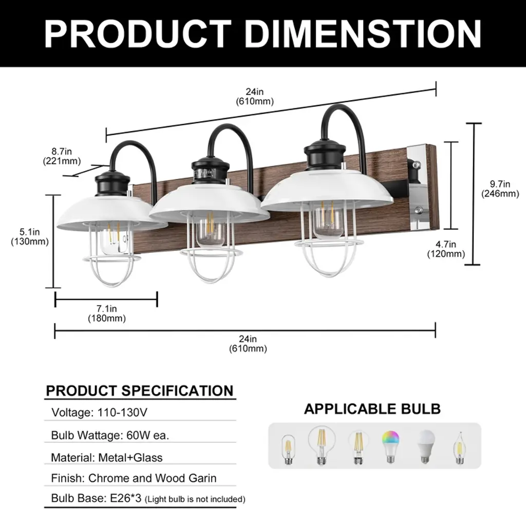 Enhance your space with the 24 in. 3-Light Chrome and Wood Grain Vanity Light. This modern fixture combines sleek chrome with warm wood grain finishes. The white bell-shaped shades offer bright illumination, ideal for bathrooms, mirrors, or kitchens, adding a touch of elegance to your daily routine.