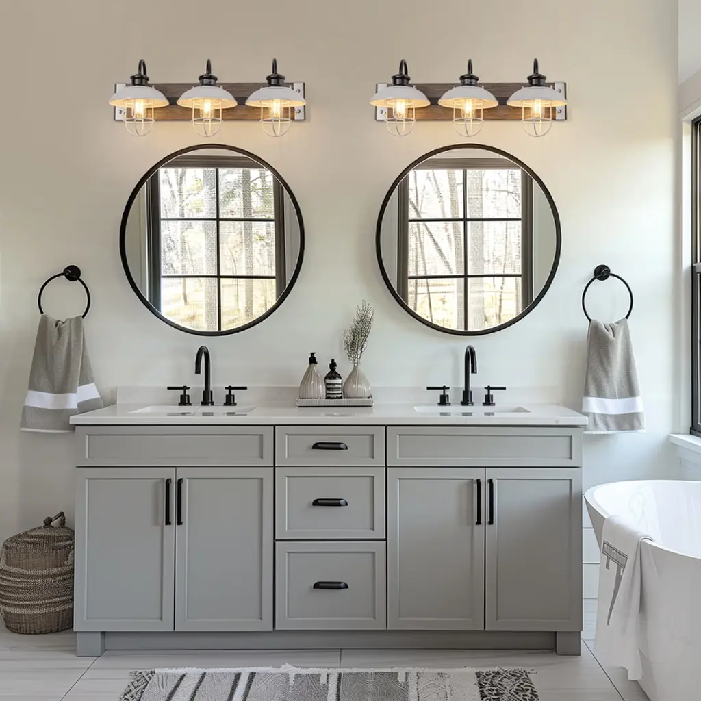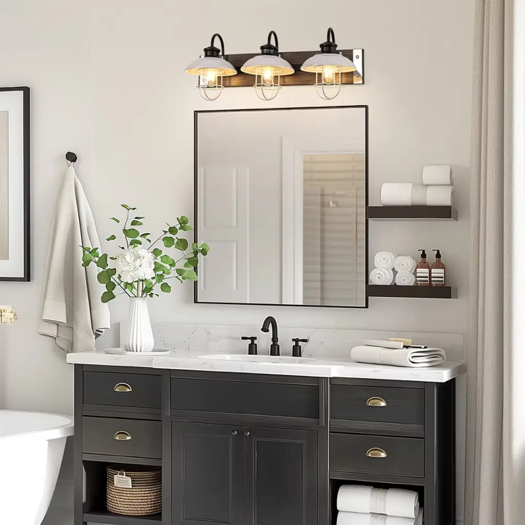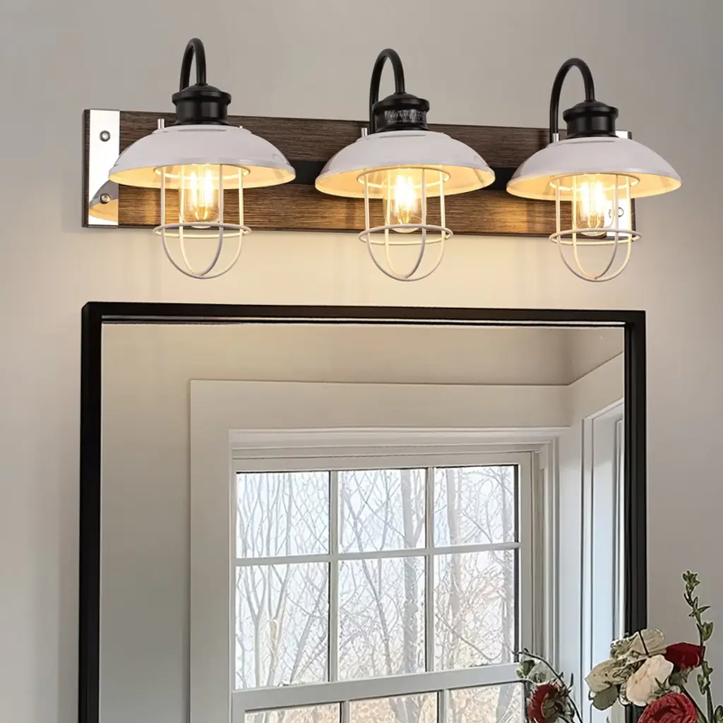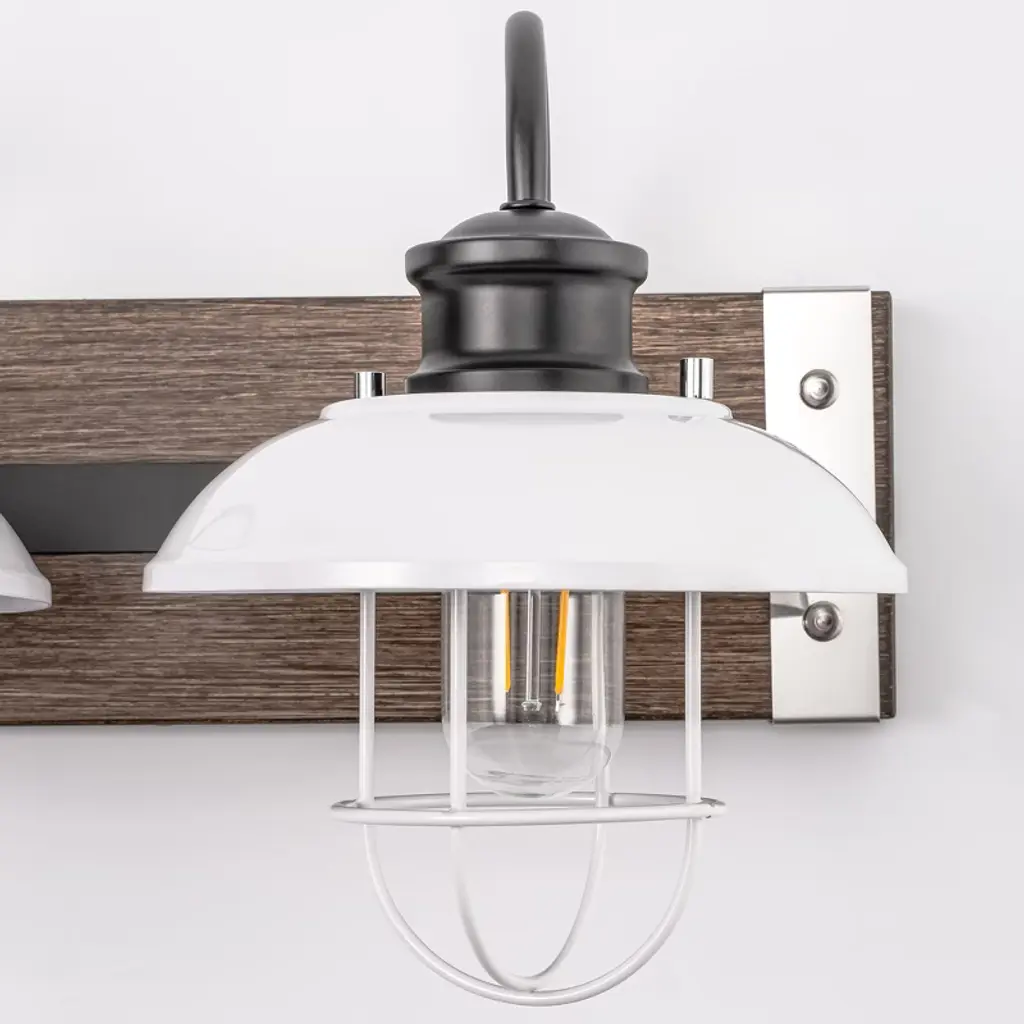 Enhance your space with the 24 in. 3-Light Chrome and Wood Grain Vanity Light. This modern fixture combines sleek chrome with warm wood grain finishes. The white bell-shaped shades offer bright illumination, ideal for bathrooms, mirrors, or kitchens, adding a touch of elegance to your daily routine.