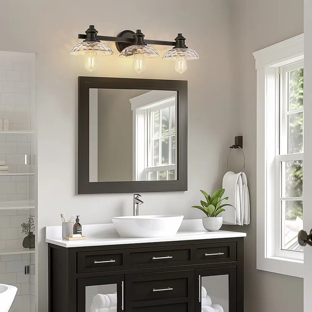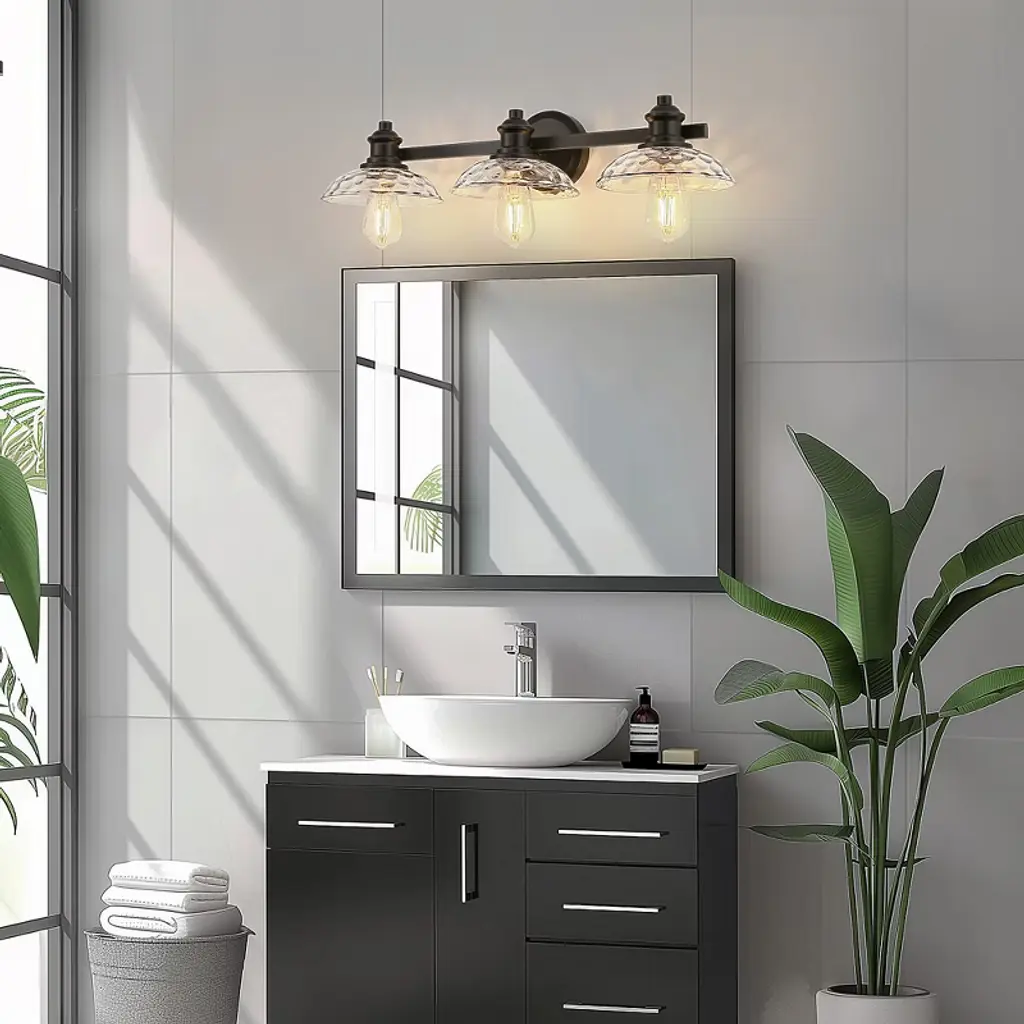 Elevate your bathroom's style with this Matte Black 3-Light Vanity Light, showcasing sleek clear cylinder glass shades that offer a modern touch. Designed to provide bright, elegant lighting, this fixture is perfect for vanities and bathrooms. With versatile installation options, it easily adapts to different spaces, combining both functionality and minimalist design.