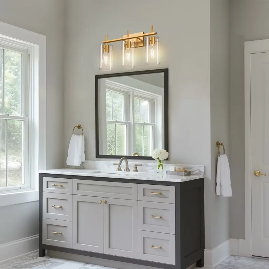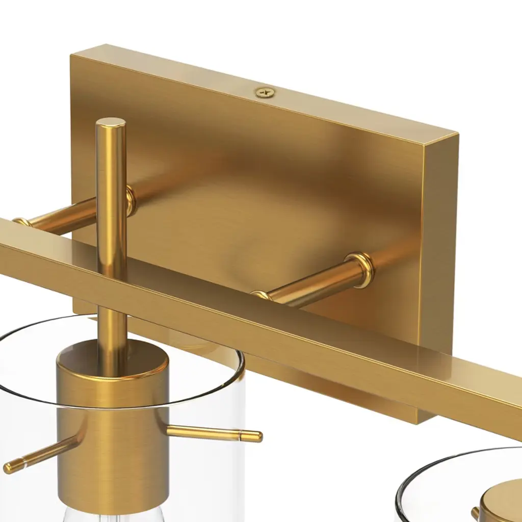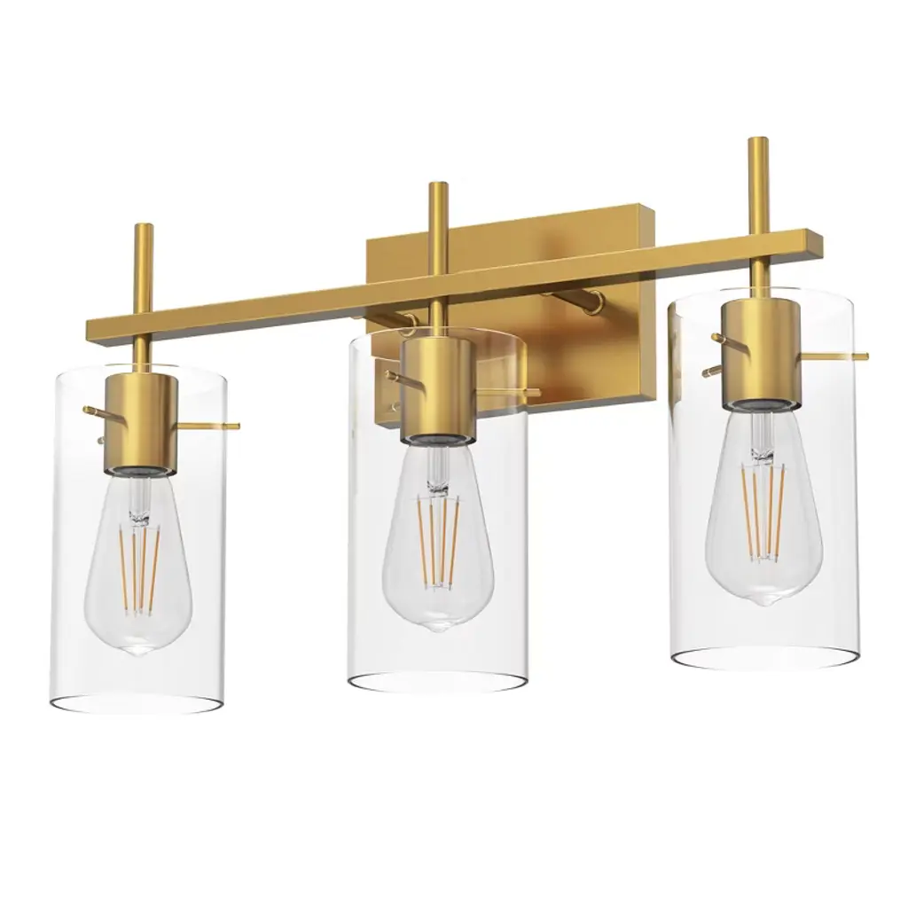 Brighten your bathroom or dressing area with this 3-head vanity light featuring a luxurious gold finish and pierced glass shades. The through-head design accommodates E26 bulbs (not included) for flexible brightness and lighting options. Crafted with durable metal and glass, this fixture combines elegance with functionality, adding a stylish and sophisticated touch to any space.