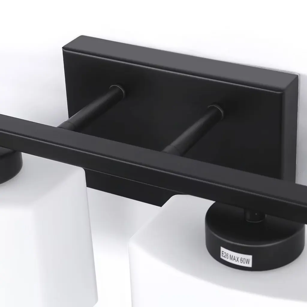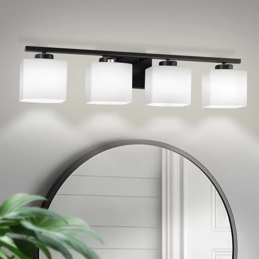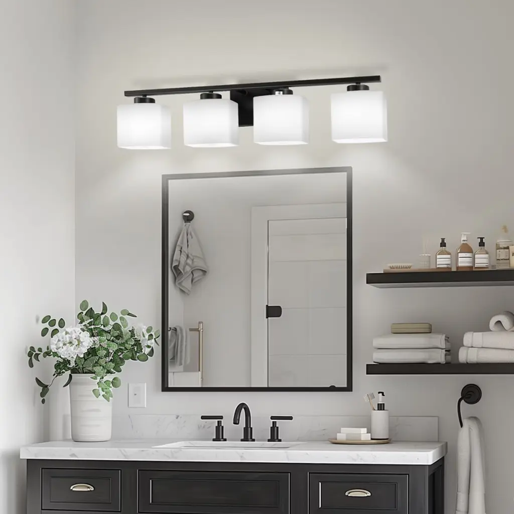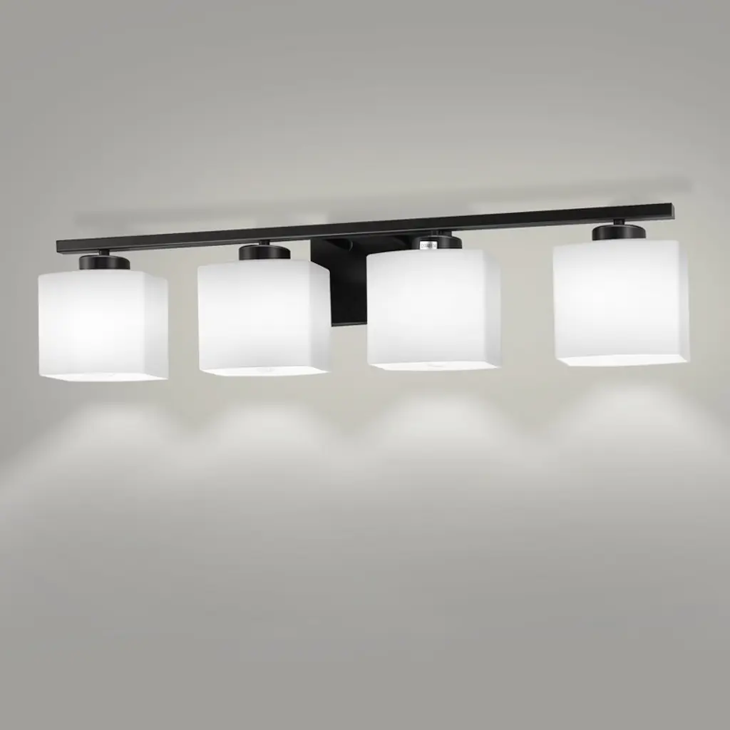 Enhance your space with the 31 in. 4 Light Matte Black Modern Square Vanity Light. This sleek fixture combines contemporary design with functional lighting, featuring a matte black finish and square milk white glass shades. Perfect for various settings, it adds a stylish and practical touch to bathrooms, bedrooms, living rooms, hallways, offices, dining rooms, entryways, and basements.