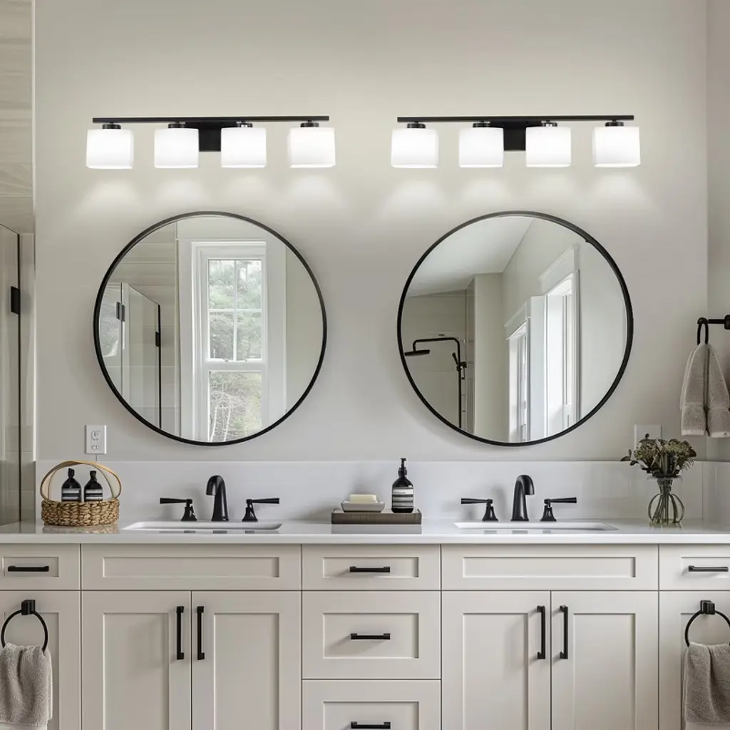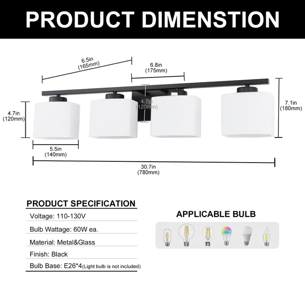 Doresshop 31 In. 4 Light Matte Black Modern Square Vanity Light For Bathroom, Bedroom, Hallway With Milk White Glass Shades