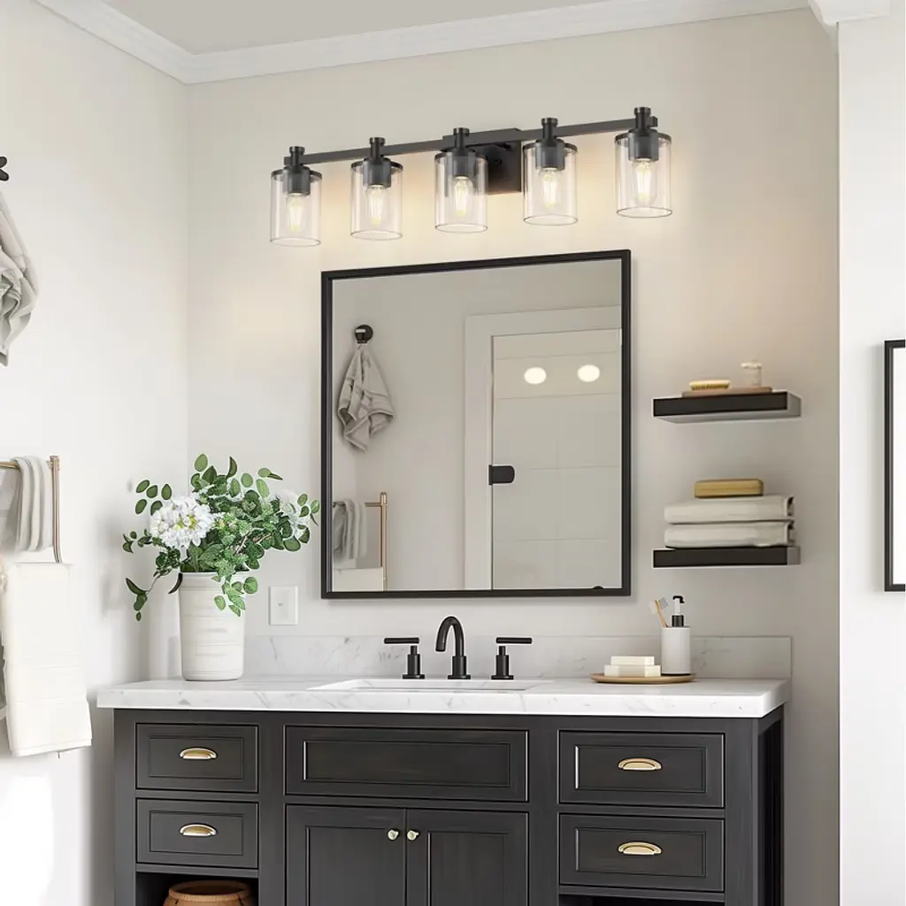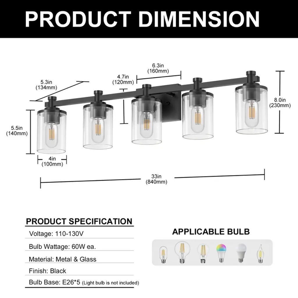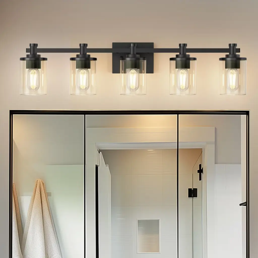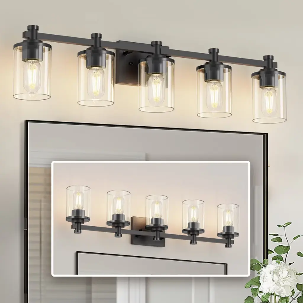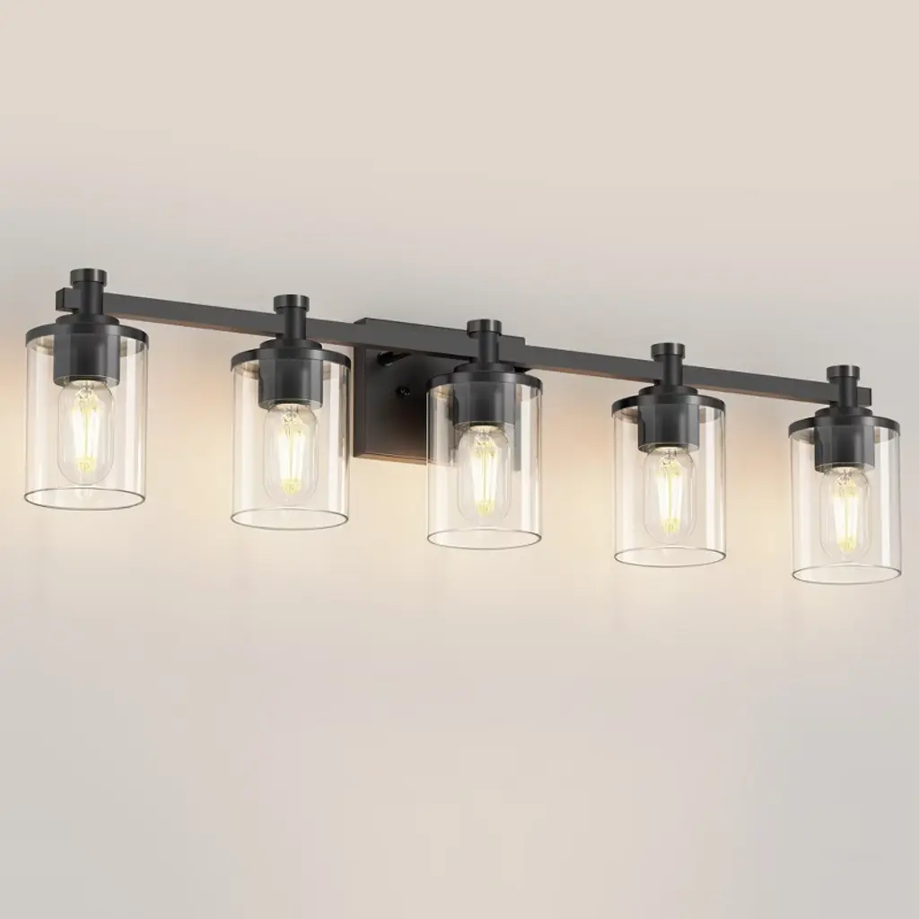 Doresshop 33 In. 5-light Black Bathroom Vanity Light With Clear Glass Shades For Bathroom, Bedroom, Or Hallway