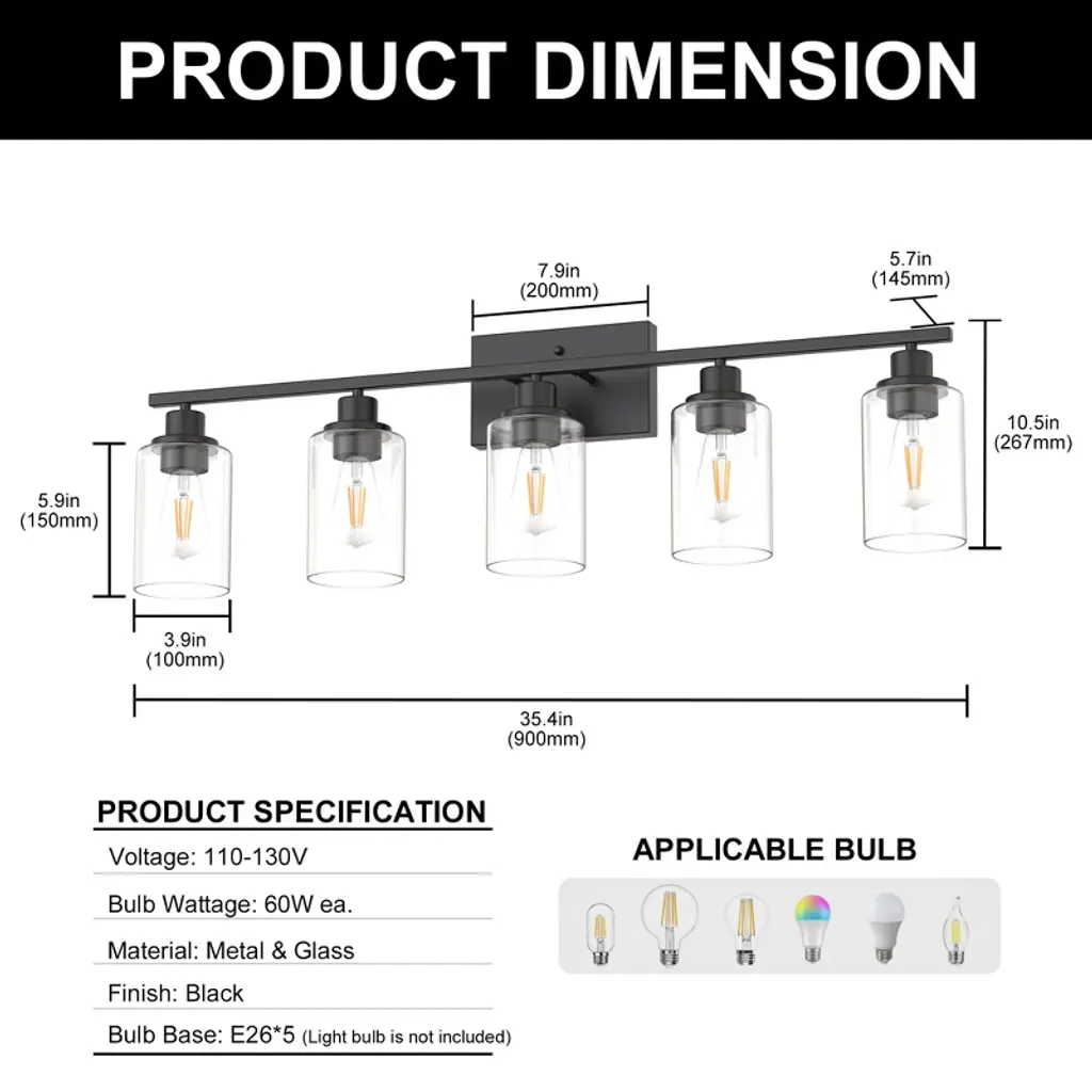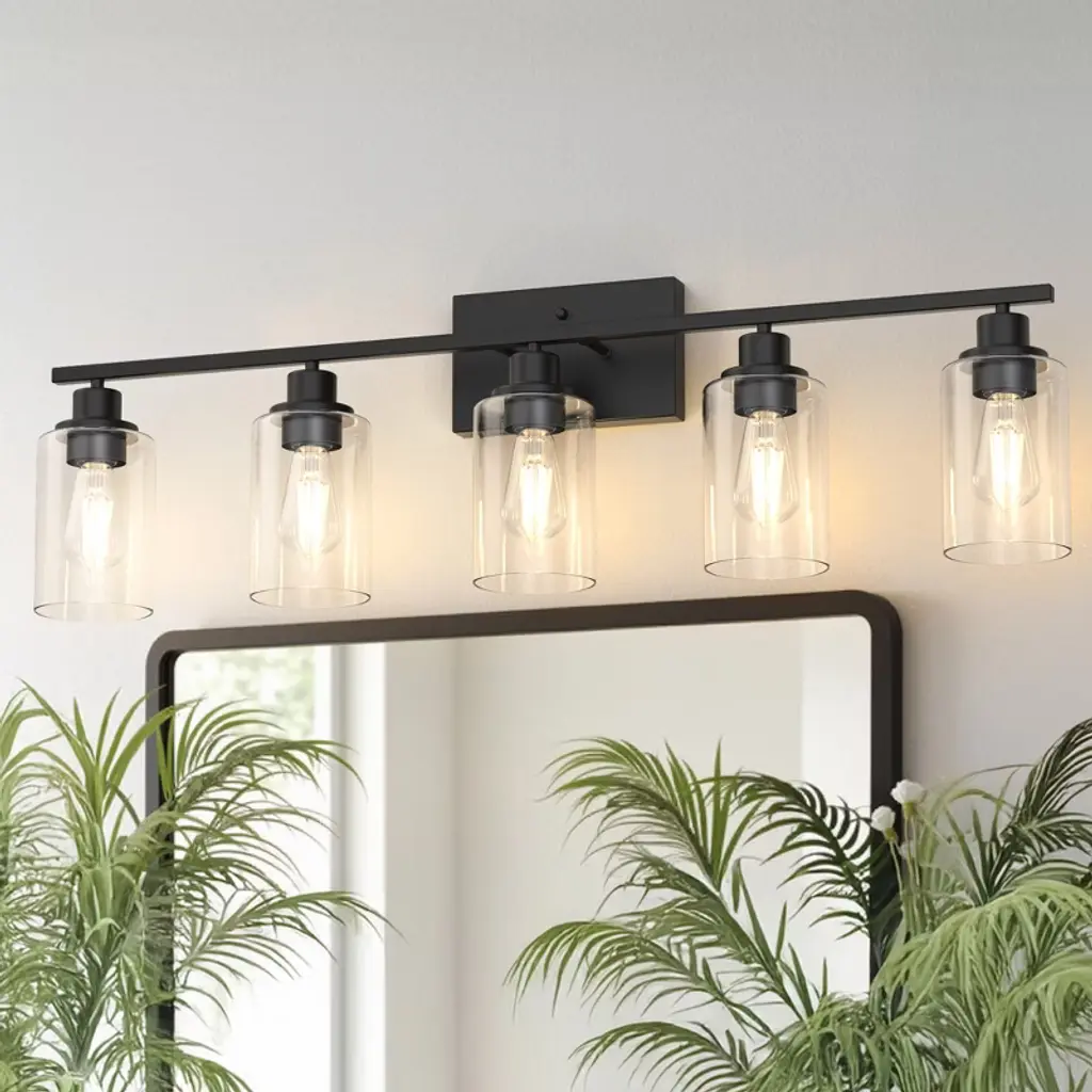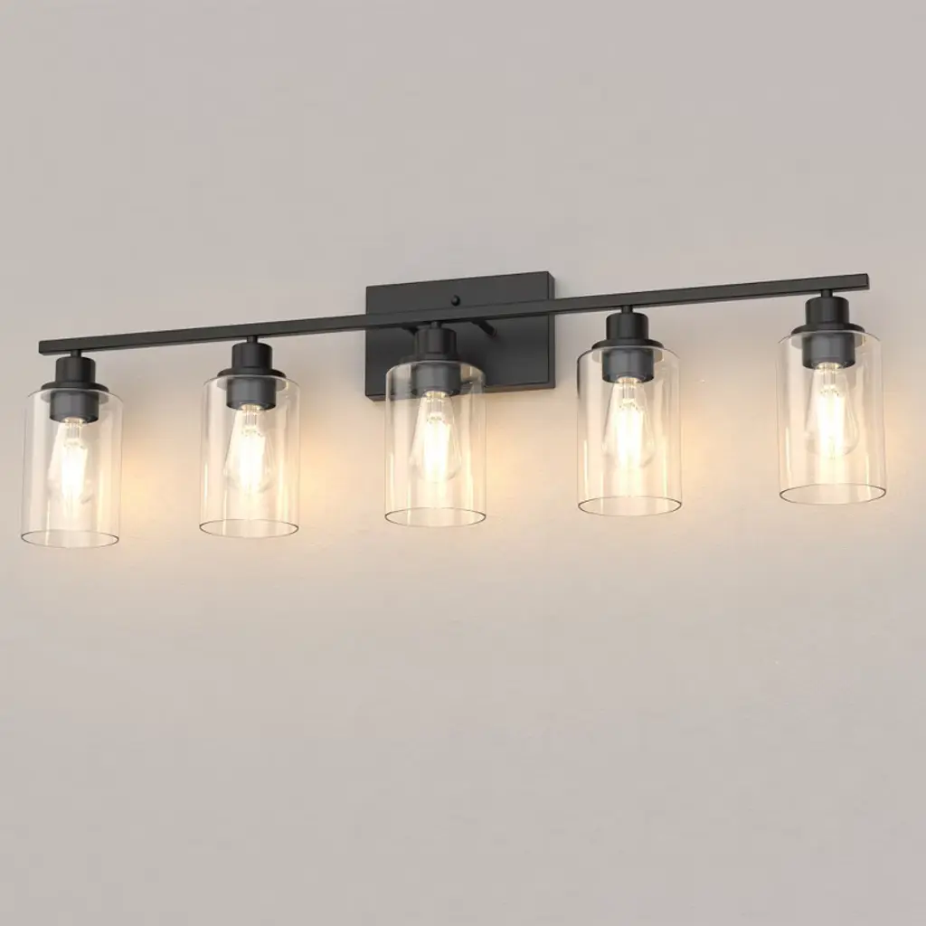 Enhance your bathroom or vanity space with this vintage industrial 5-light vanity fixture, designed to bring timeless character and modern functionality to your home. The matte black finish paired with clear cylindrical glass shades offers a bold yet elegant look, perfect for a variety of interior styles from farmhouse to modern industrial.This fixture uses five E26 base bulbs (not included), providing ample illumination and flexibility to choose your preferred brightness and color temperature.