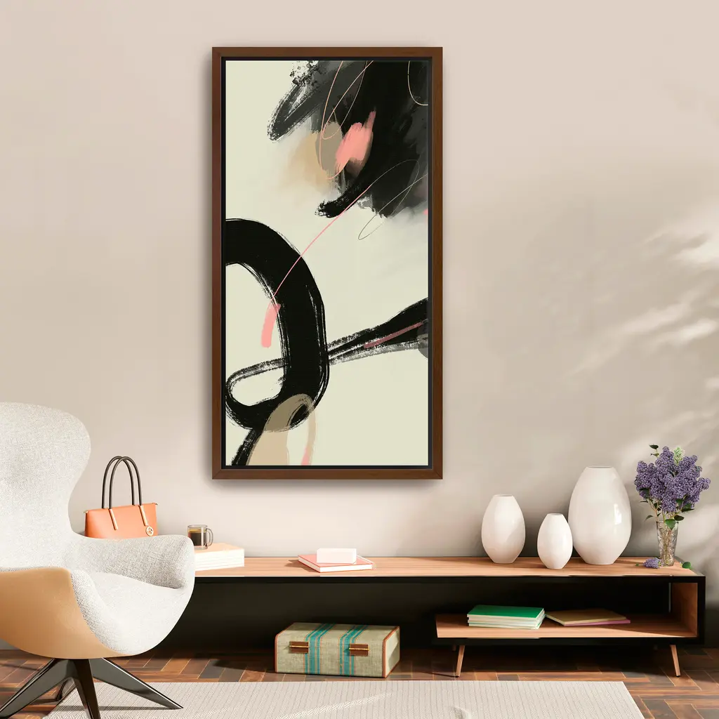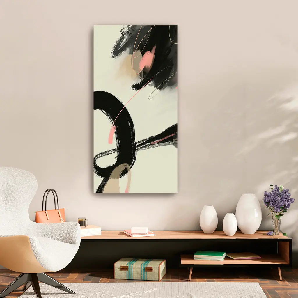 Bold black strokes intertwine with soft blush accents on a clean, creamy canvas, creating a dynamic balance between strength and subtlety. This abstract composition exudes modern elegance, perfect for adding artistic flair to minimalist or contemporary spaces. Our Gallery Wrap Canvas Prints are proudly assembled with high quality materials in California, USA. Each piece is printed on a thick, archival grade canvas using Giclee technology. It is then hand-stretched by our experienced artisans over solid wood bars, which will not warp over time. The final product is a piece personally crafted for you to confidently display on your wall. Care and Assembly: Ensure that the location of your piece has little to no exposure to heat, sunlight, and moisture. Wipe clean, only if needed. Each piece includes hanging hardware to hang on your wall vertically.