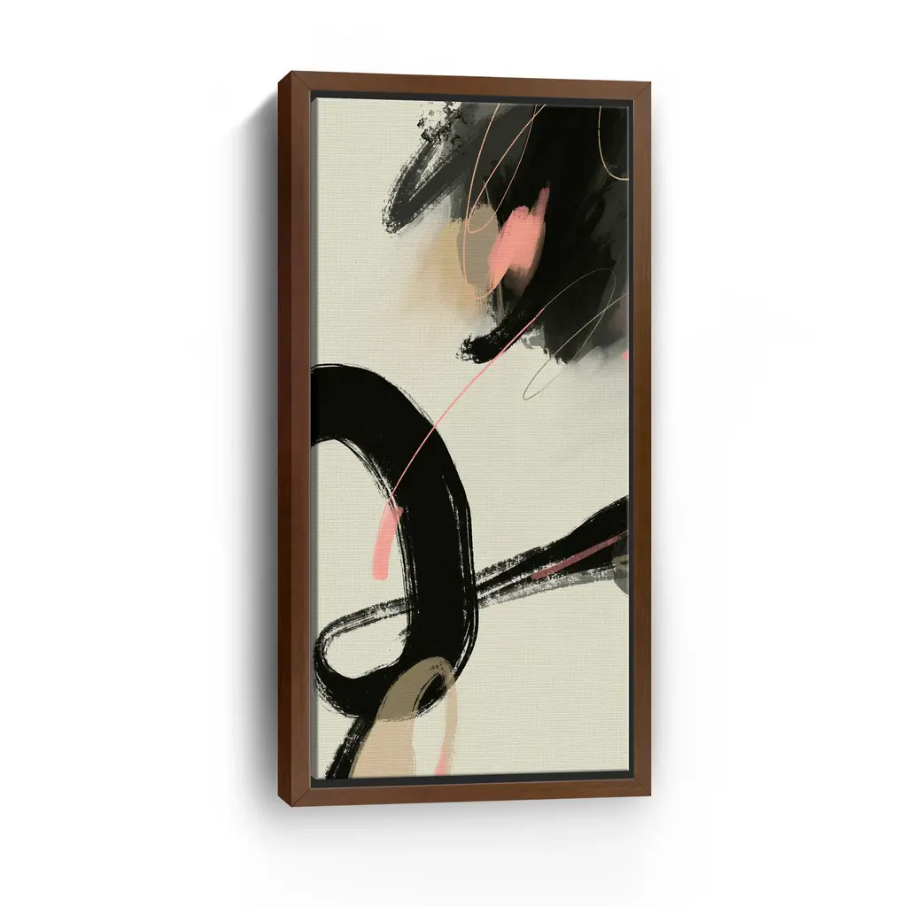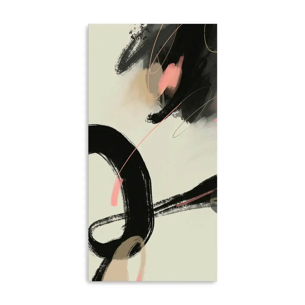Bold black strokes intertwine with soft blush accents on a clean, creamy canvas, creating a dynamic balance between strength and subtlety. This abstract composition exudes modern elegance, perfect for adding artistic flair to minimalist or contemporary spaces. Our Gallery Wrap Canvas Prints are proudly assembled with high quality materials in California, USA. Each piece is printed on a thick, archival grade canvas using Giclee technology. It is then hand-stretched by our experienced artisans over solid wood bars, which will not warp over time. The final product is a piece personally crafted for you to confidently display on your wall. Care and Assembly: Ensure that the location of your piece has little to no exposure to heat, sunlight, and moisture. Wipe clean, only if needed. Each piece includes hanging hardware to hang on your wall vertically.