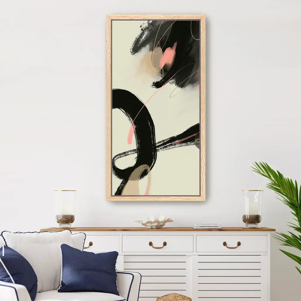 Bold black strokes intertwine with soft blush accents on a clean, creamy canvas, creating a dynamic balance between strength and subtlety. This abstract composition exudes modern elegance, perfect for adding artistic flair to minimalist or contemporary spaces. Our Gallery Wrap Canvas Prints are proudly assembled with high quality materials in California, USA. Each piece is printed on a thick, archival grade canvas using Giclee technology. It is then hand-stretched by our experienced artisans over solid wood bars, which will not warp over time. The final product is a piece personally crafted for you to confidently display on your wall. Care and Assembly: Ensure that the location of your piece has little to no exposure to heat, sunlight, and moisture. Wipe clean, only if needed. Each piece includes hanging hardware to hang on your wall vertically.