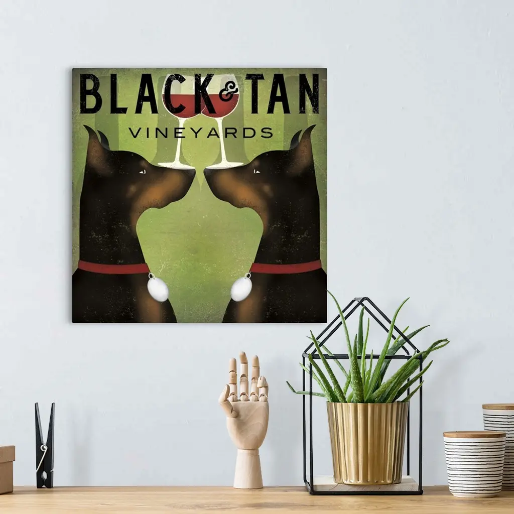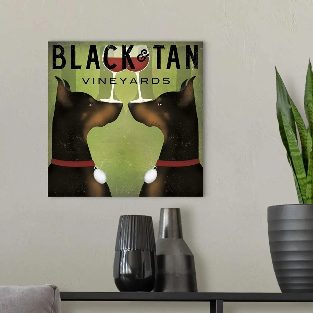 Contemporary artwork of two doberman pincers face to face like statues balancing glasses of red wine on their noses.