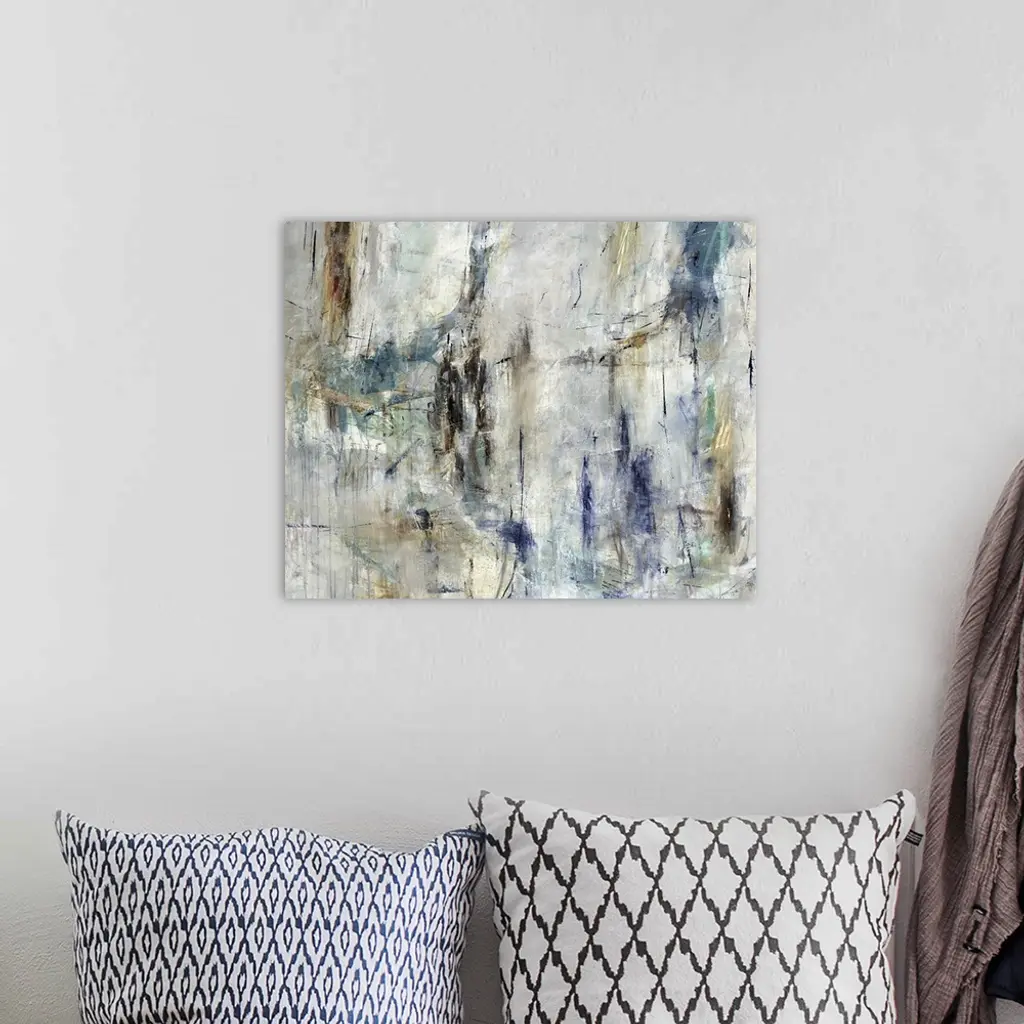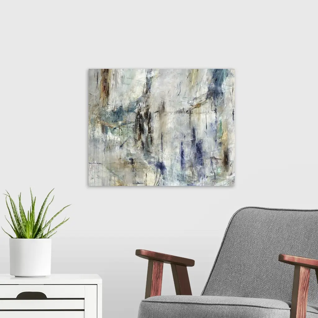 Abstract painting of a textured design in shades of gray and brown with accents of blue throughout.
