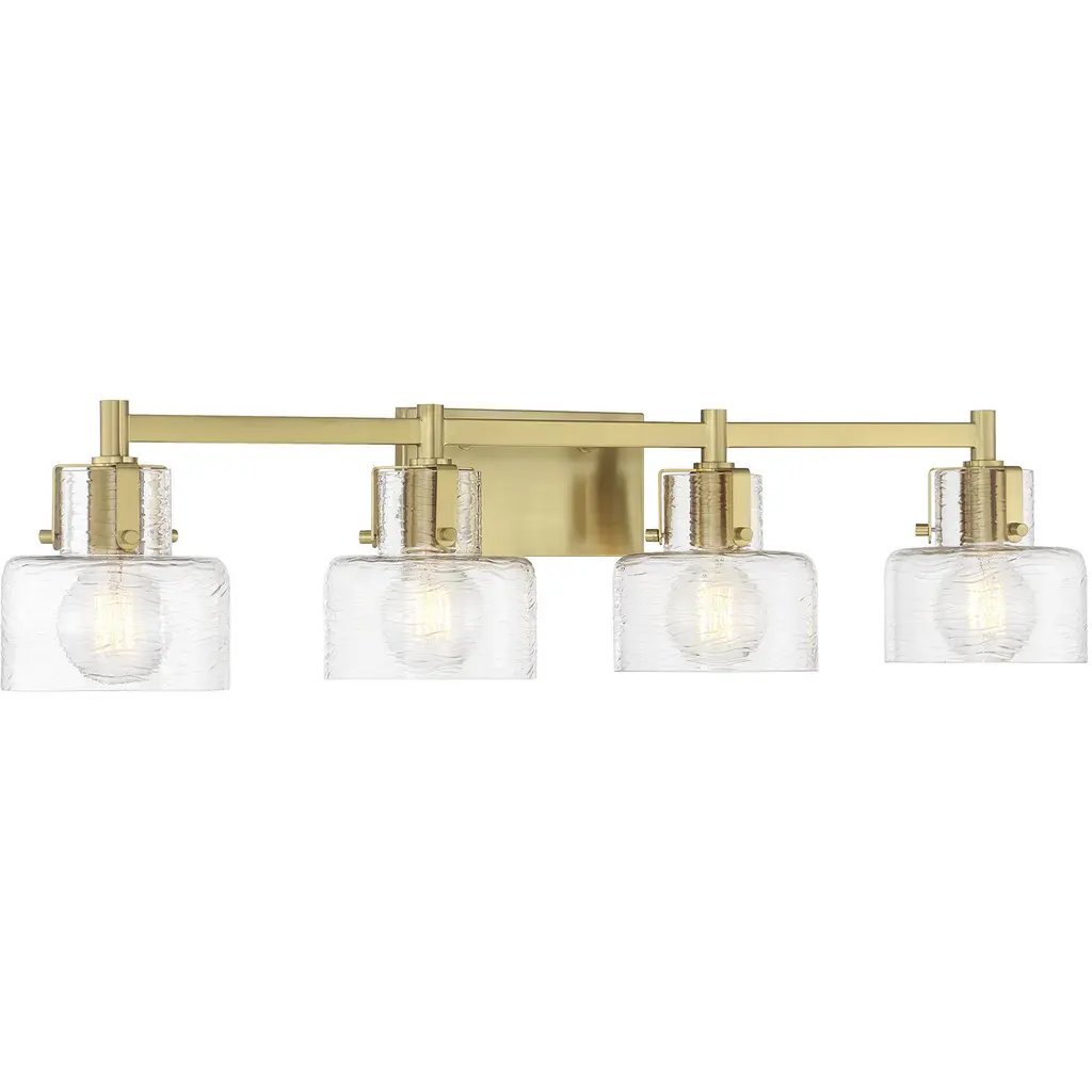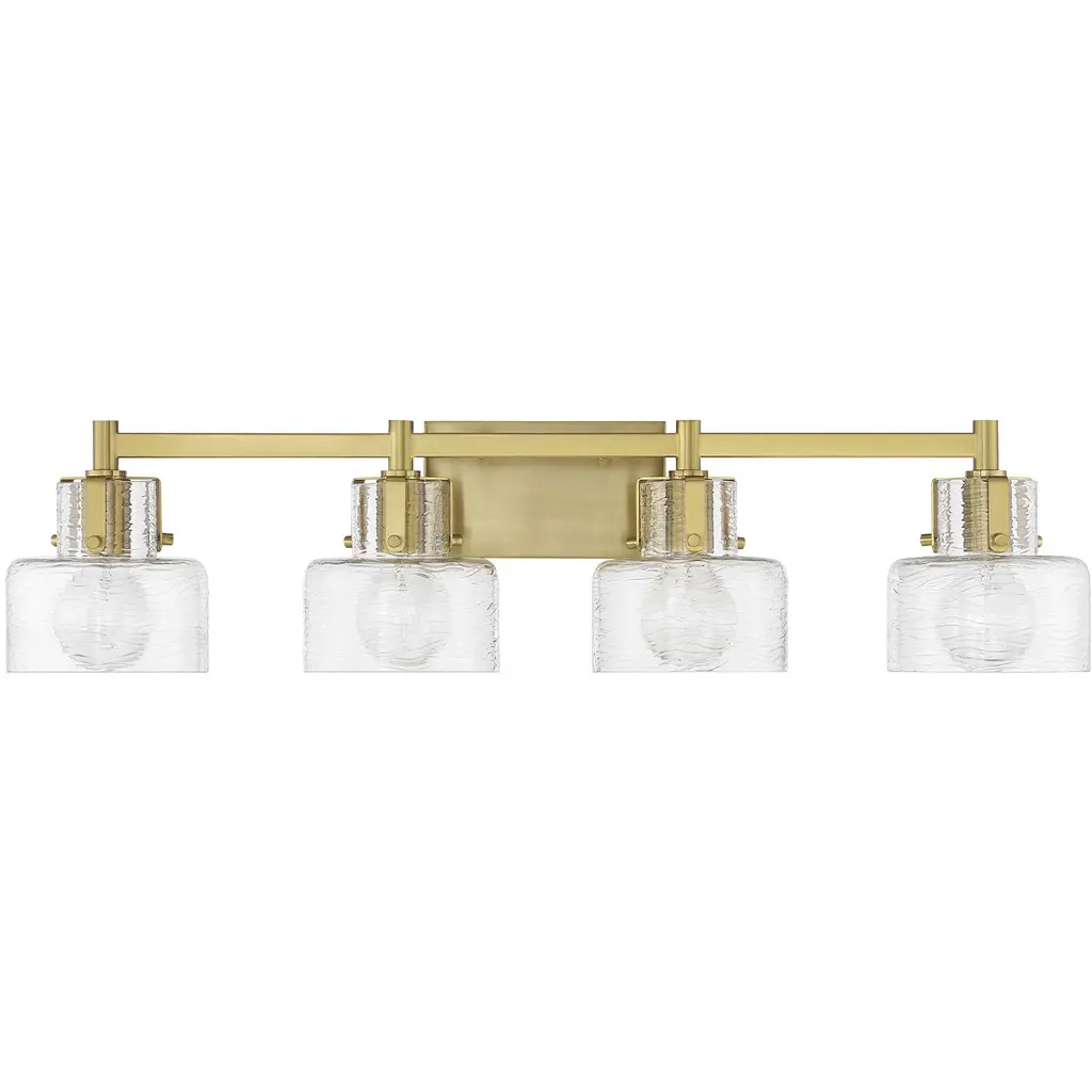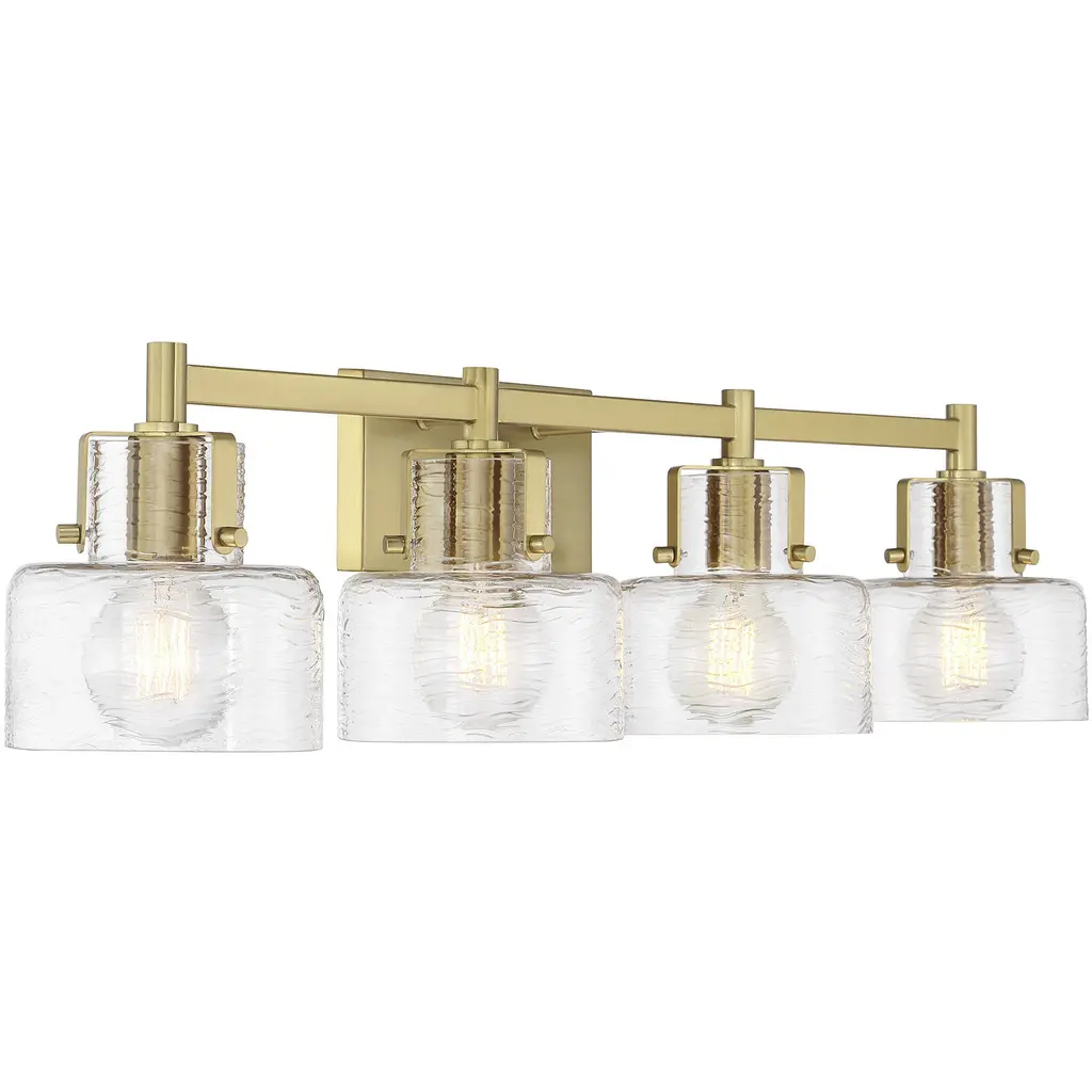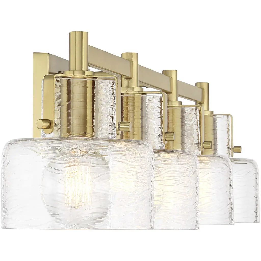 The Savoy House Dover 4-light bath light showcases standout bathroom lighting style Clear glass shades feature a beautifully textured pattern that recalls ocean waves. These glass shades are held to the base by arms that are finished in Warm Brass and decorated with visible hardware to add a hint of vintage inspiration. Dover is 8.25" in height, 33.25" in width and extends 7.5" from the wall. It uses four standard size bulbs of up to 60 watts per bulb. Bulbs not included. Install as pictured. This bath bar is damp area rated.
