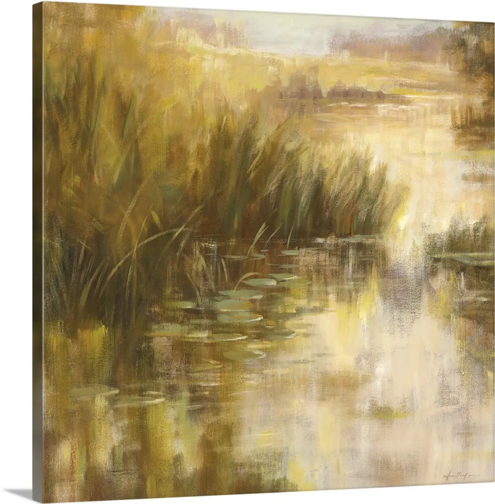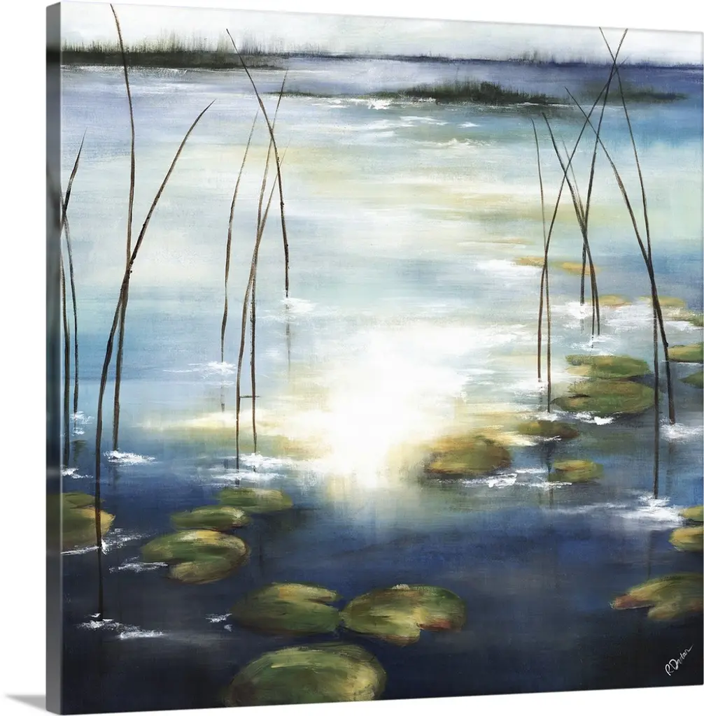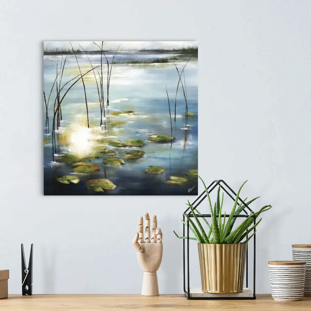 Contemporary painting of lily pads in a pond with the sun reflecting on the water.